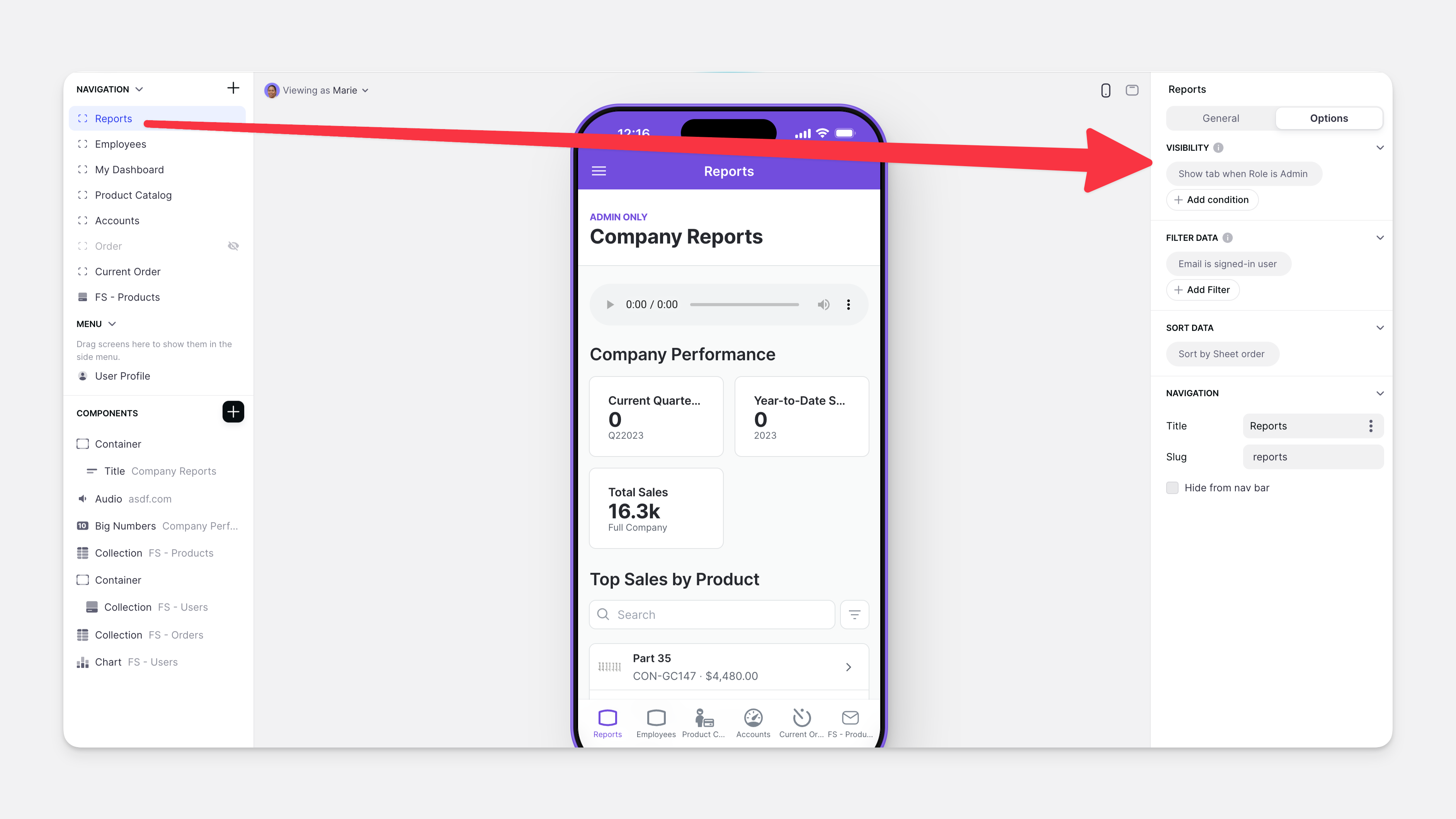 To do this, you can add conditions in the Options section of each tab. For example, in the app below, the Reports tab will only show users who have the role of Admin.