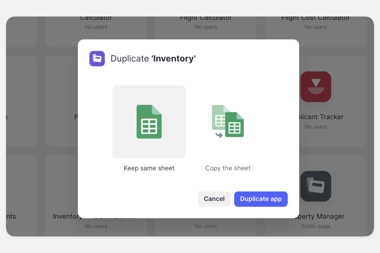 Before your project is duplicated, you’re presented with options to Keep the same sheet or Copy the sheet. This is an important decision as it will affect how your duplicated project is created, and whether or not data and tables are shared with the original project.