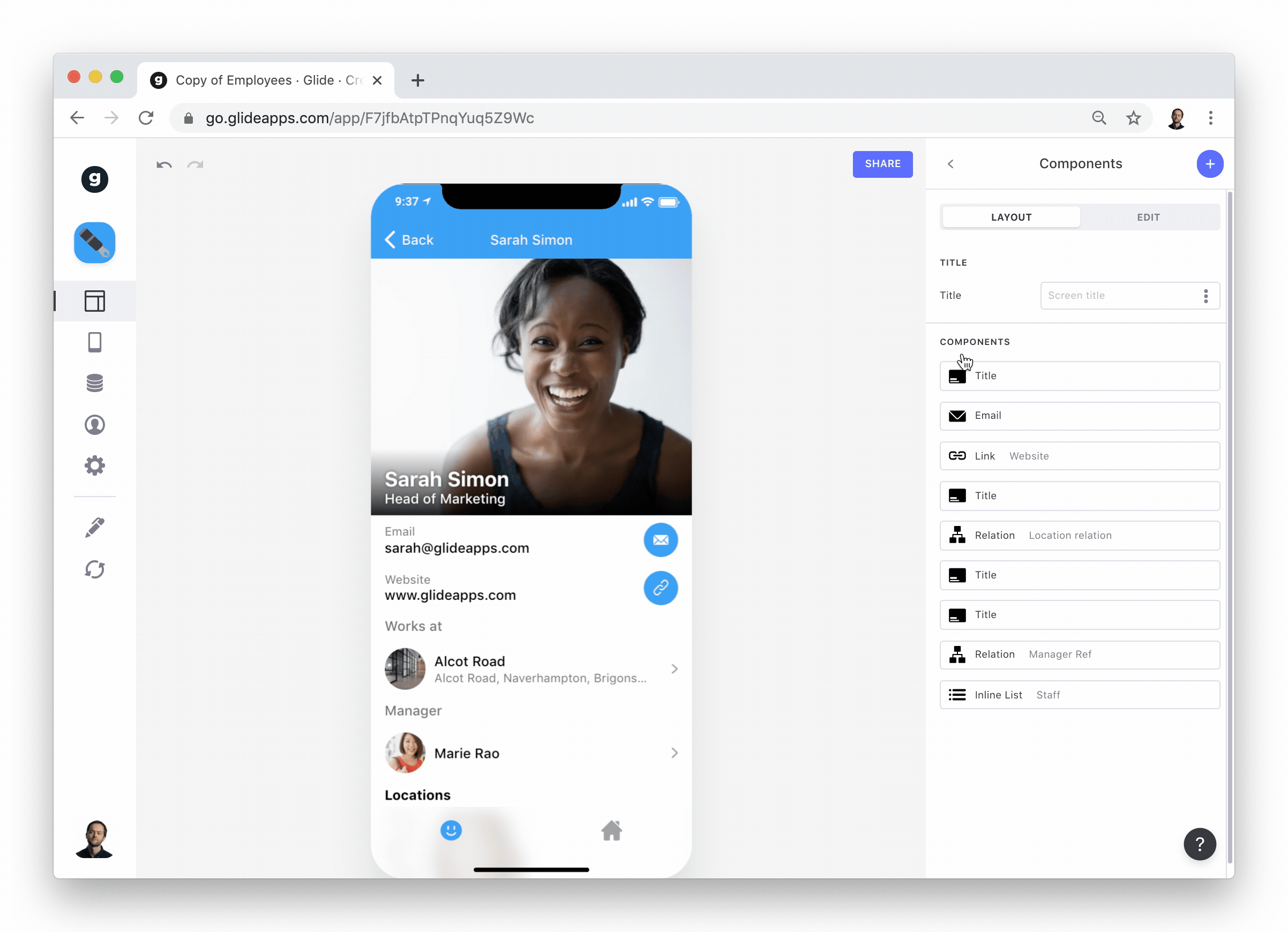You can enable the action on a component like the Button component. After you've added it, connect a column that has valid phone numbers in it and then add the Compose Text Message action.