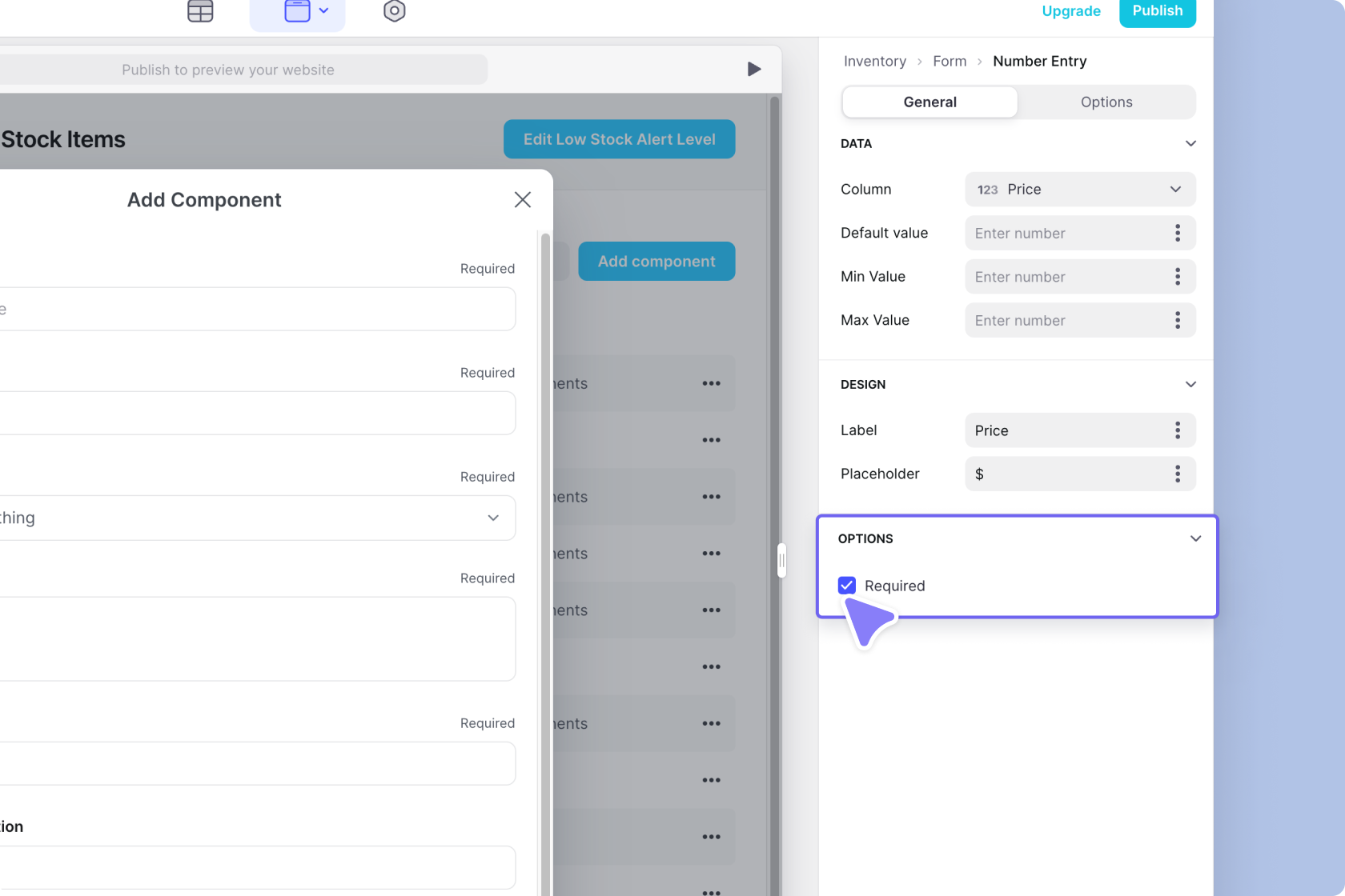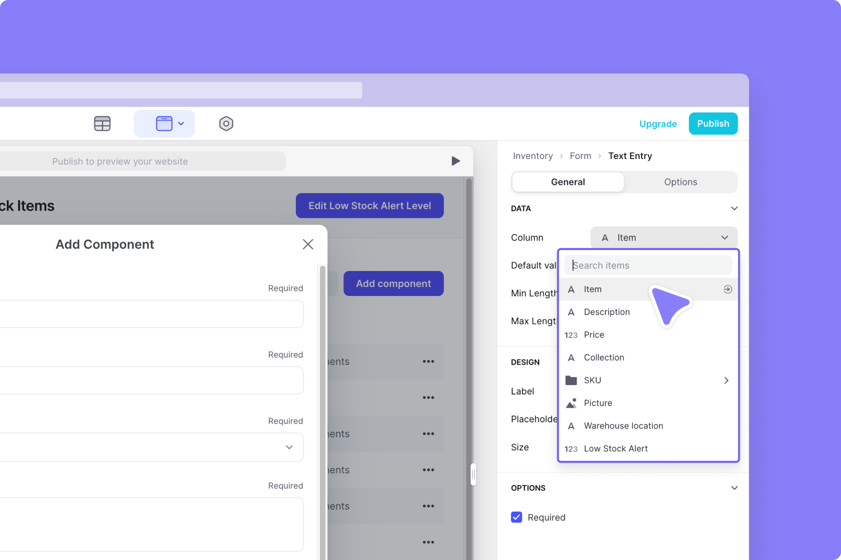 - Select a Label and Placeholder for the component. These can be columns from your data source or Custom Values.