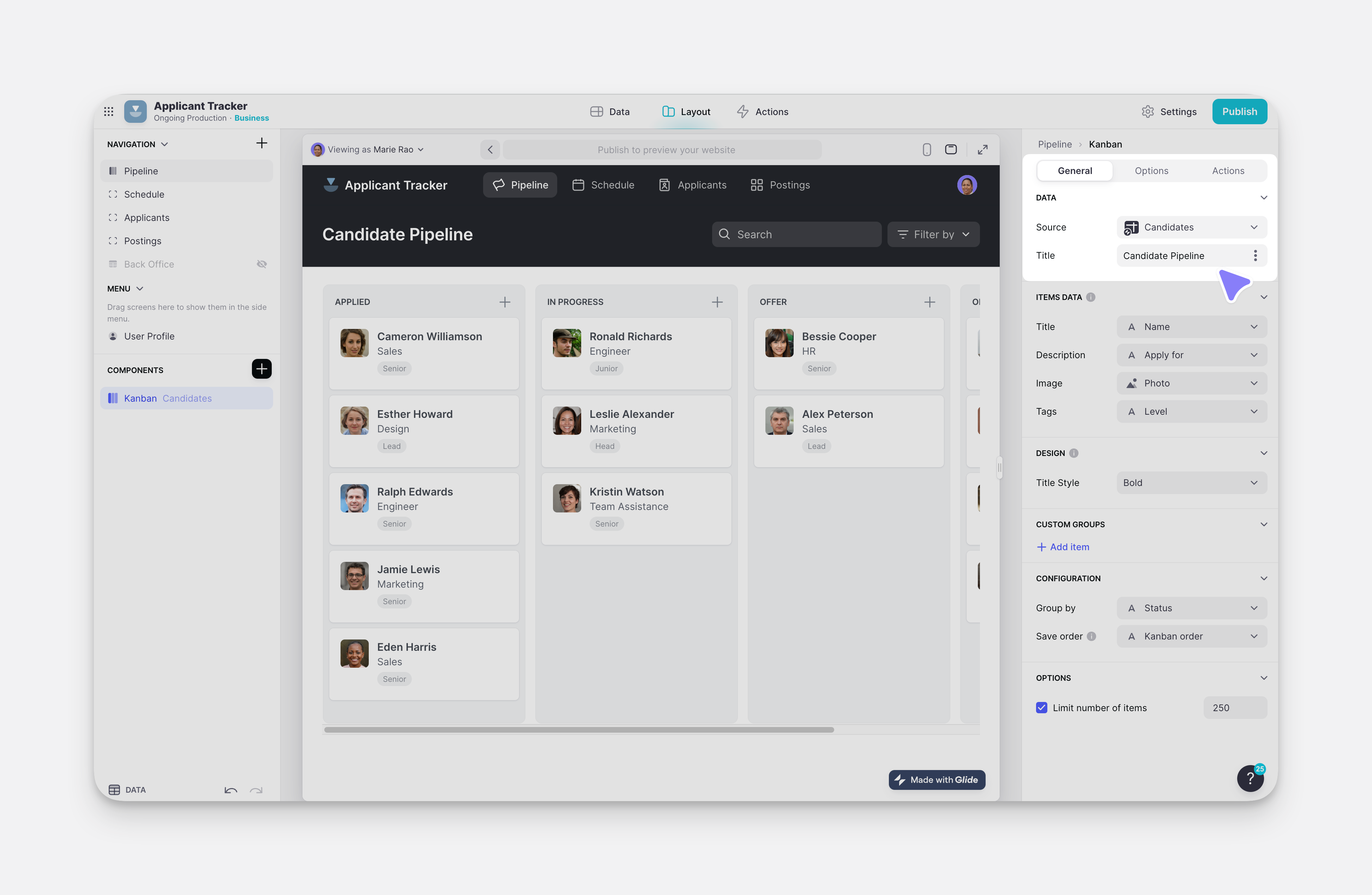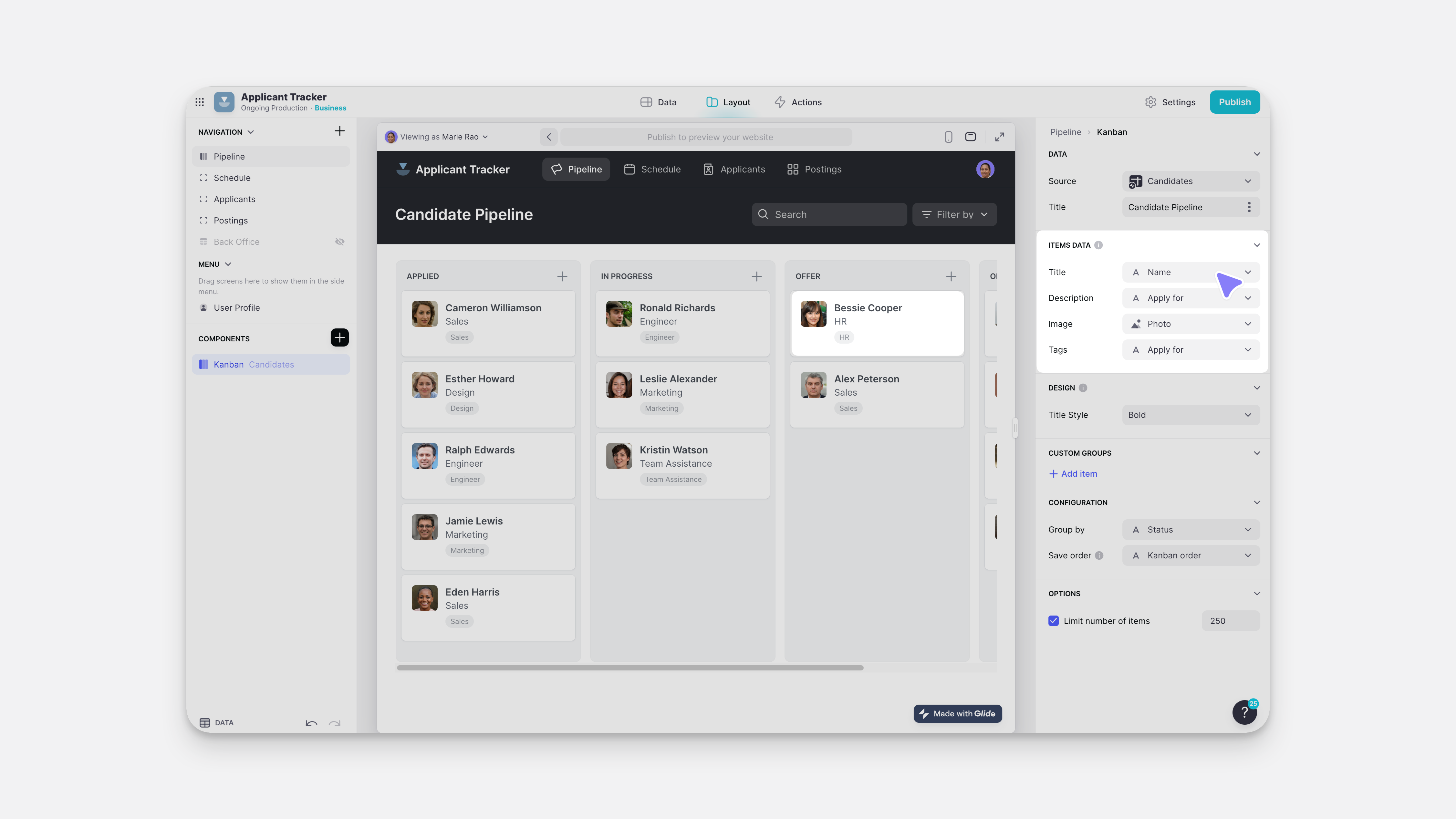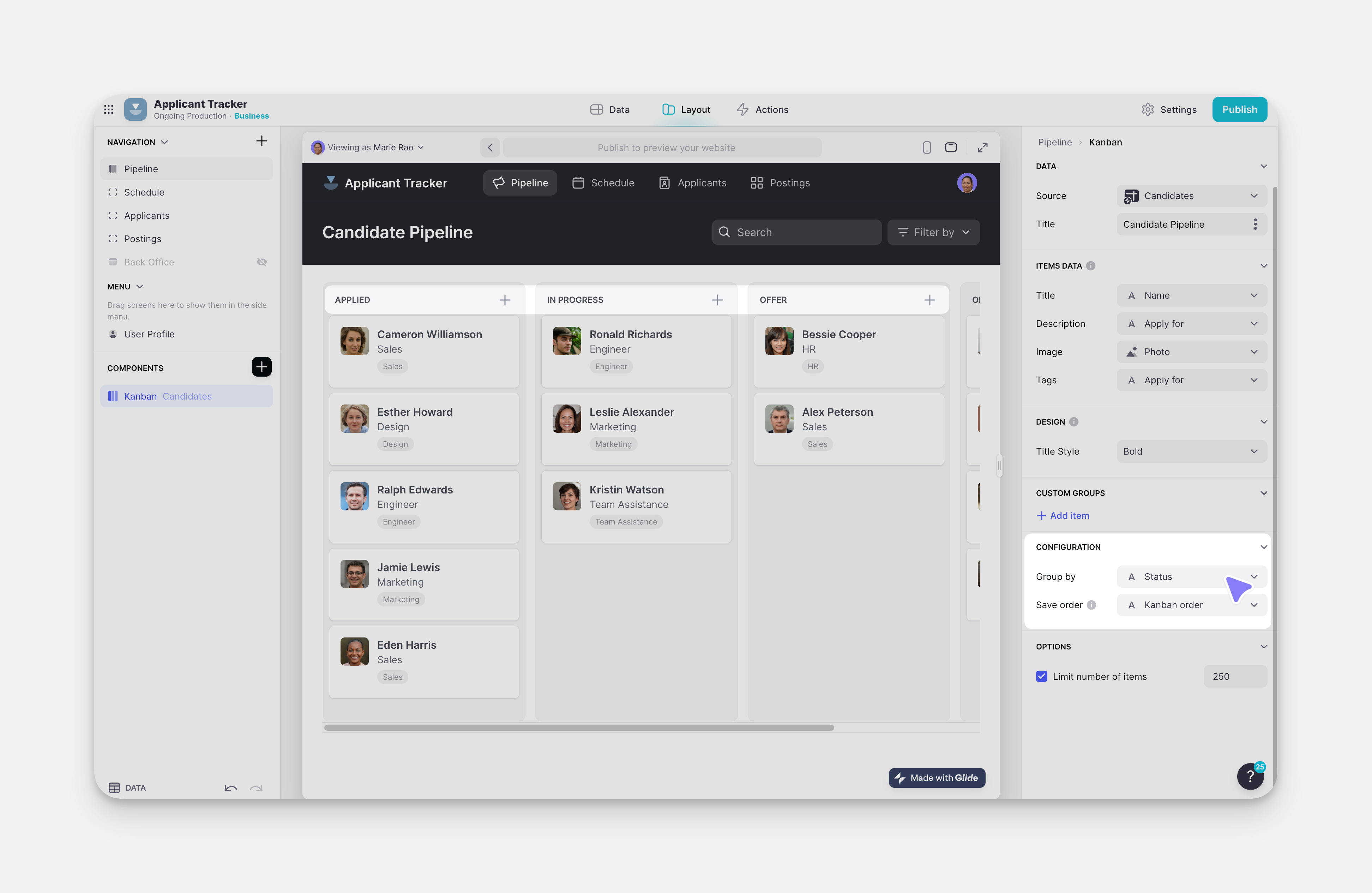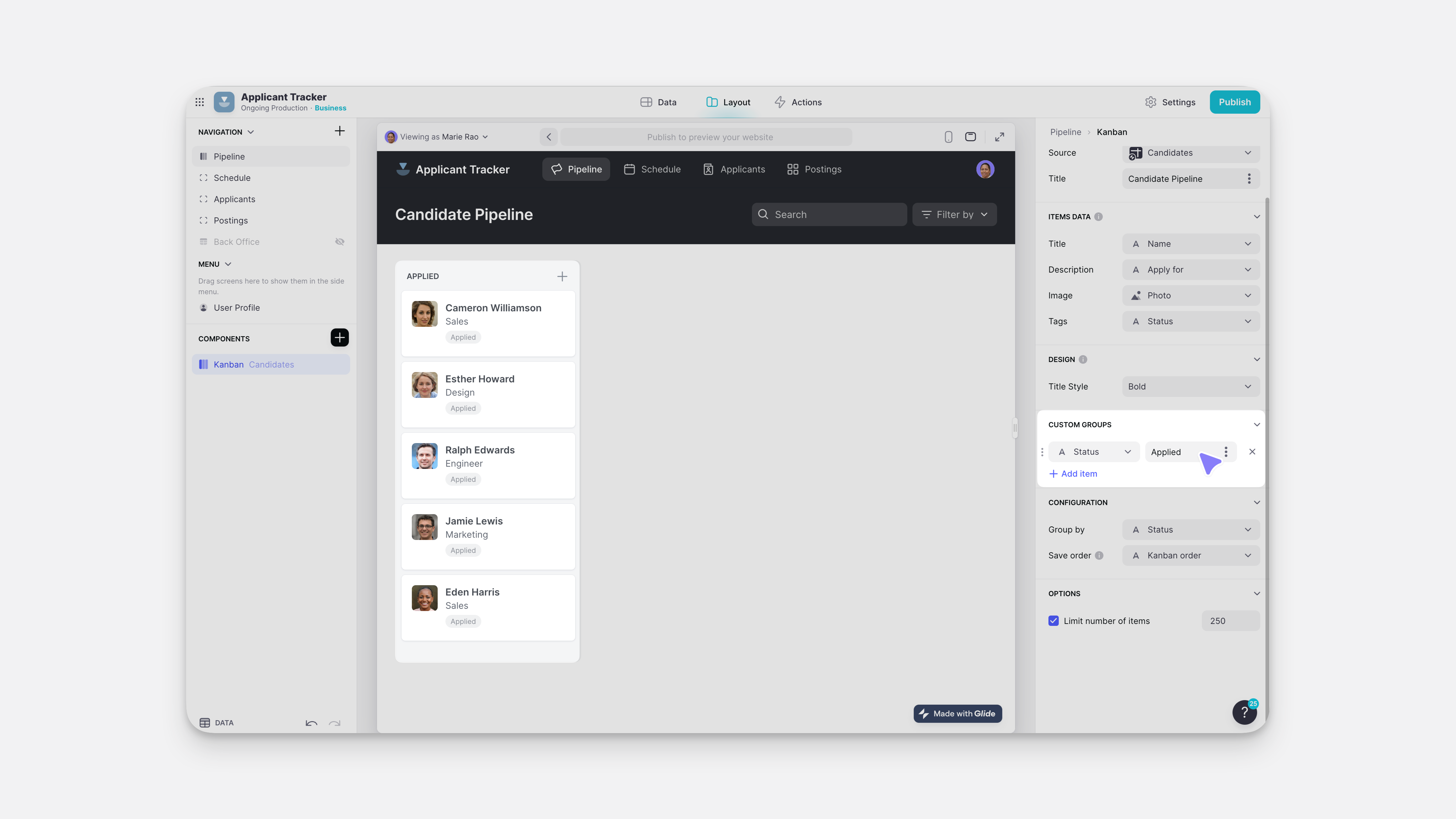 - Specify the column that items should be grouped by. For example, you can group candidates by status. Glide will automatically add a new column to the board for every unique value it finds.