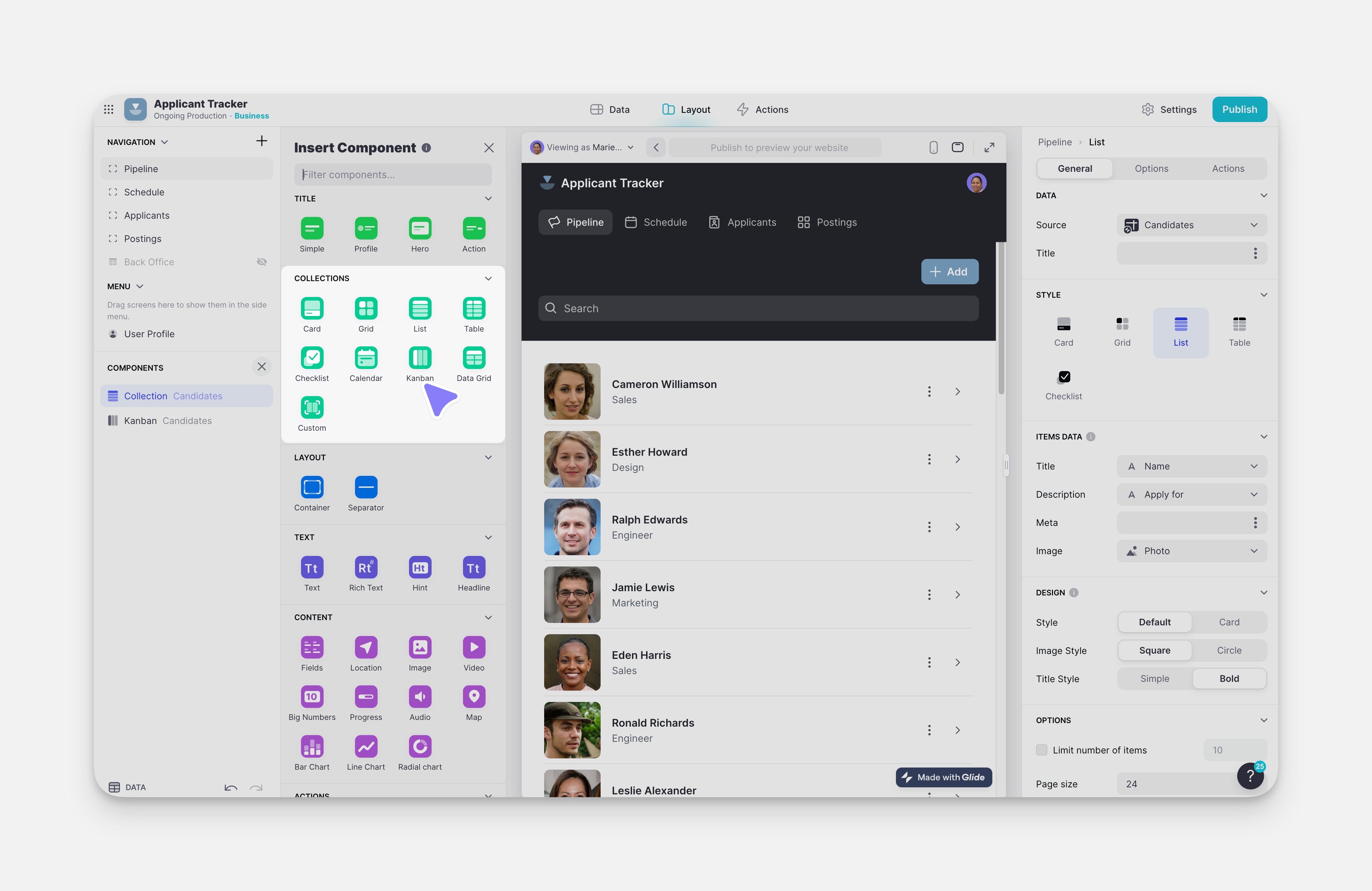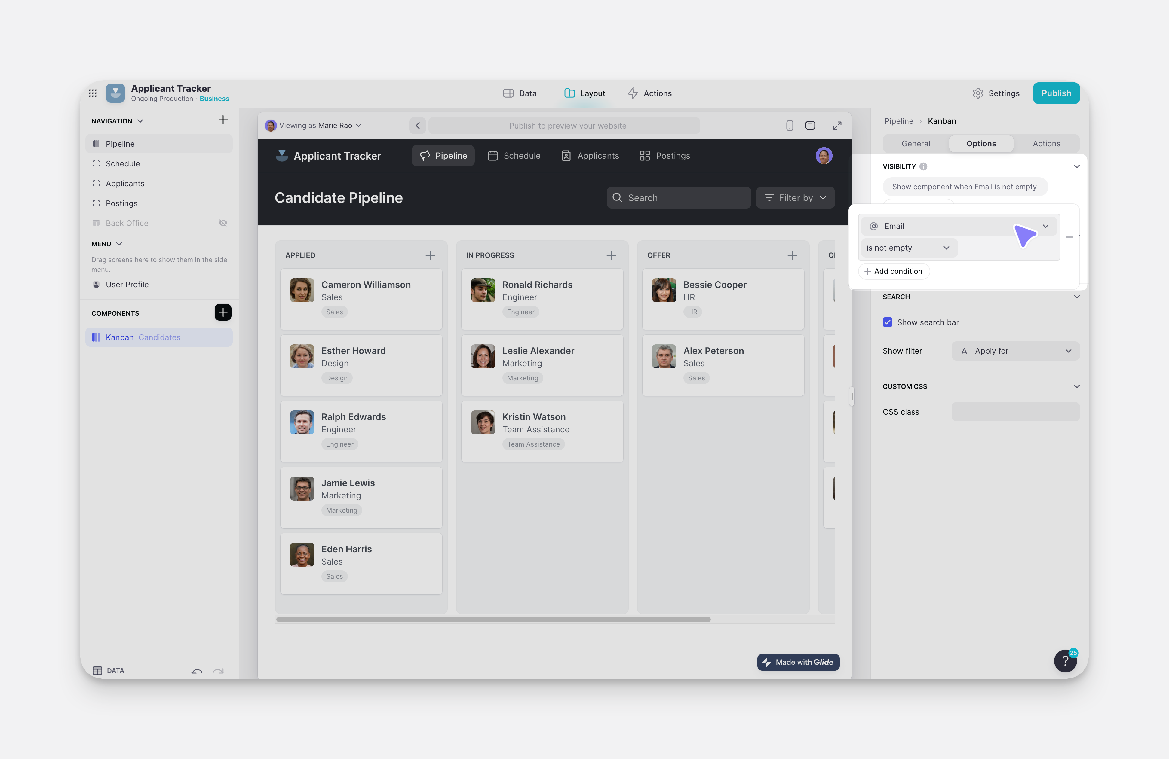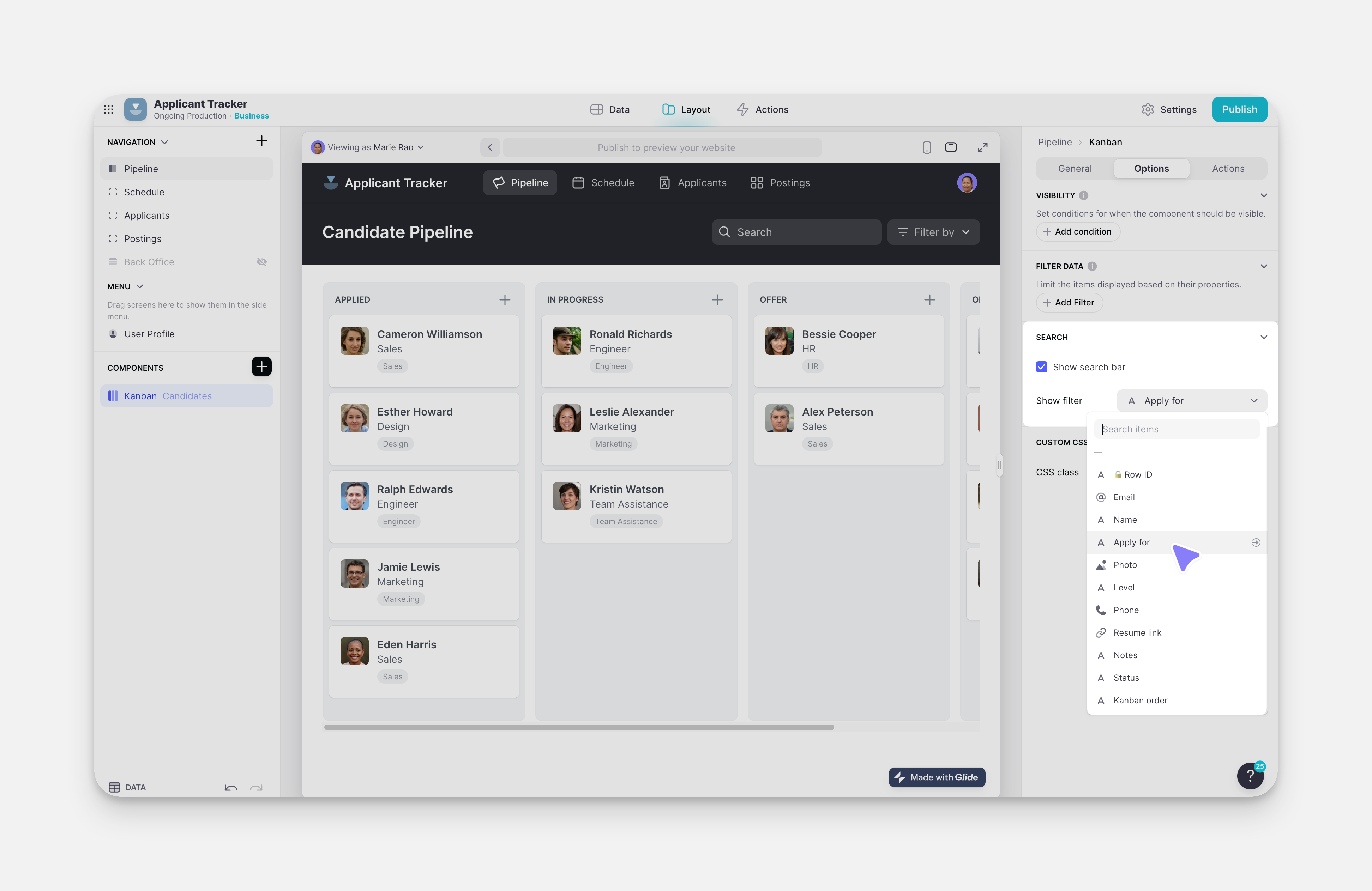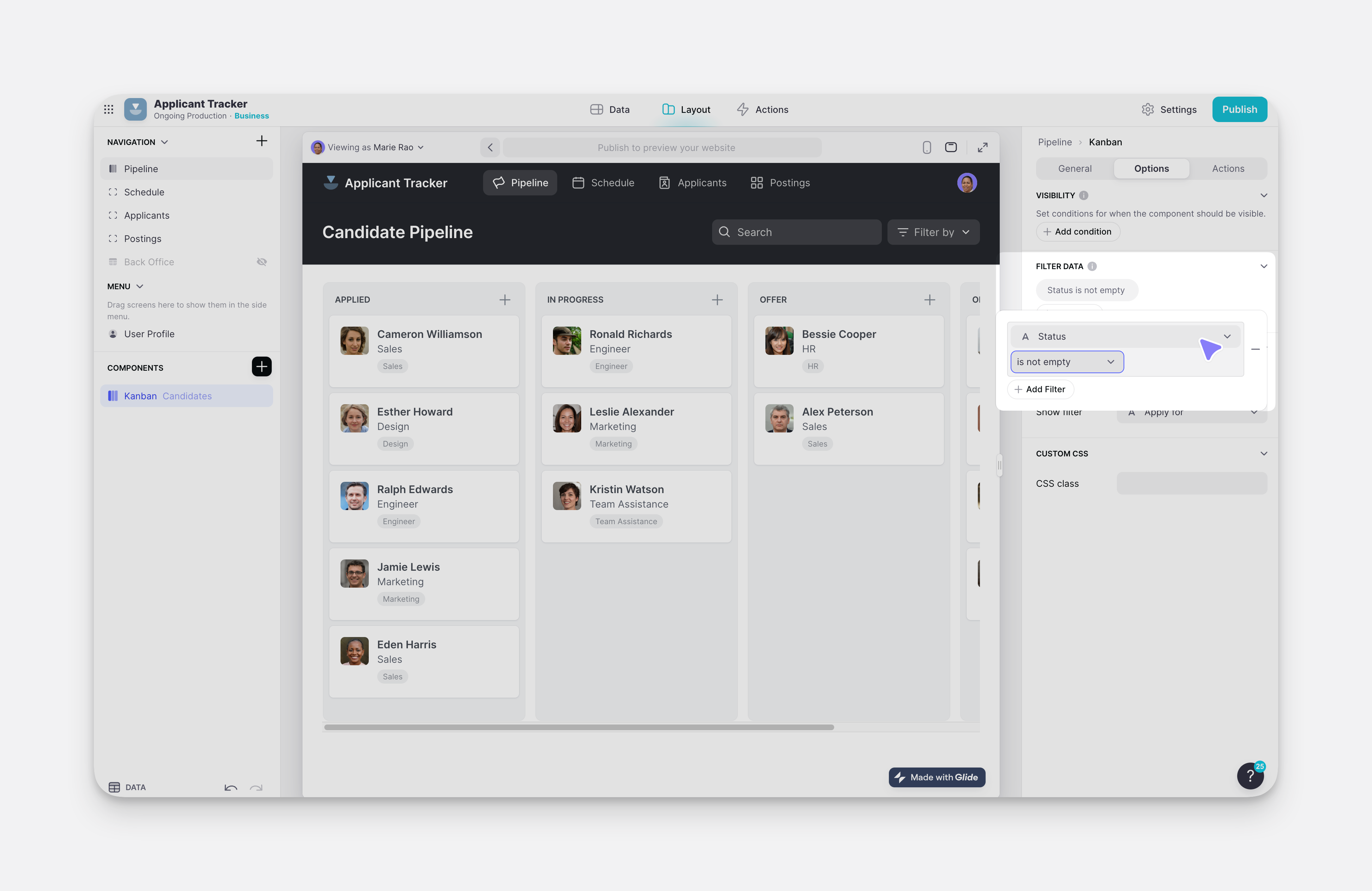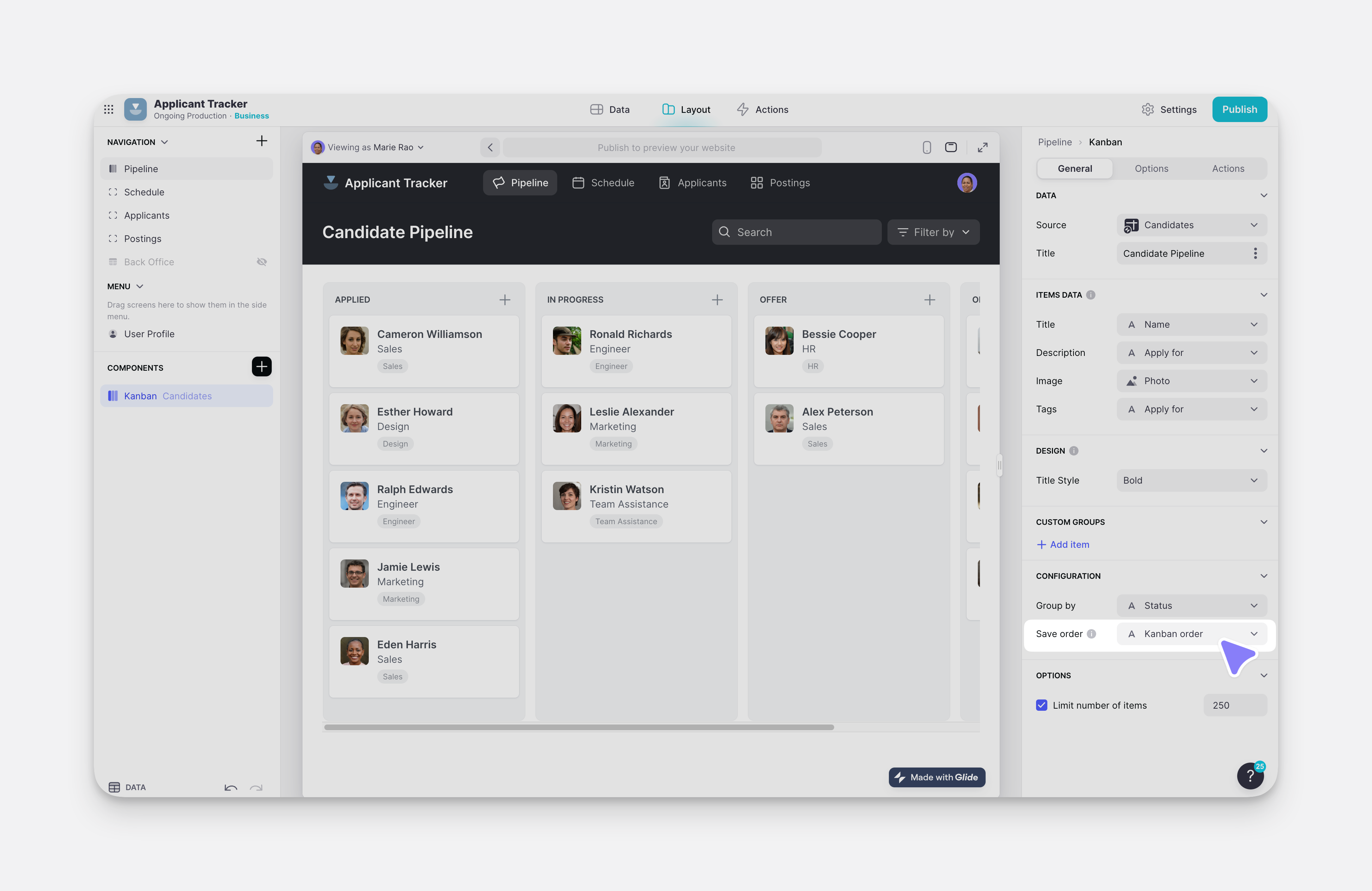 - Specify the column that items should be grouped by. For example, you can group candidates by status. Glide will automatically add a new column to the board for every unique value it finds.