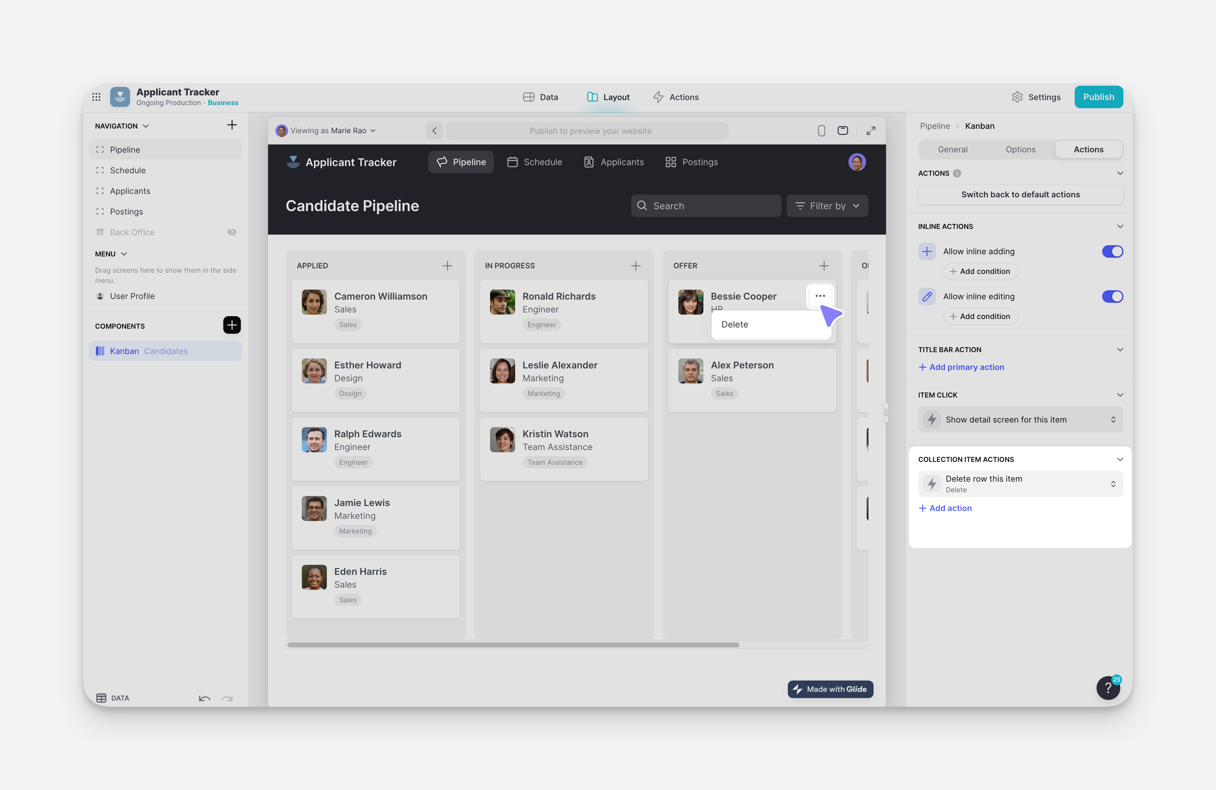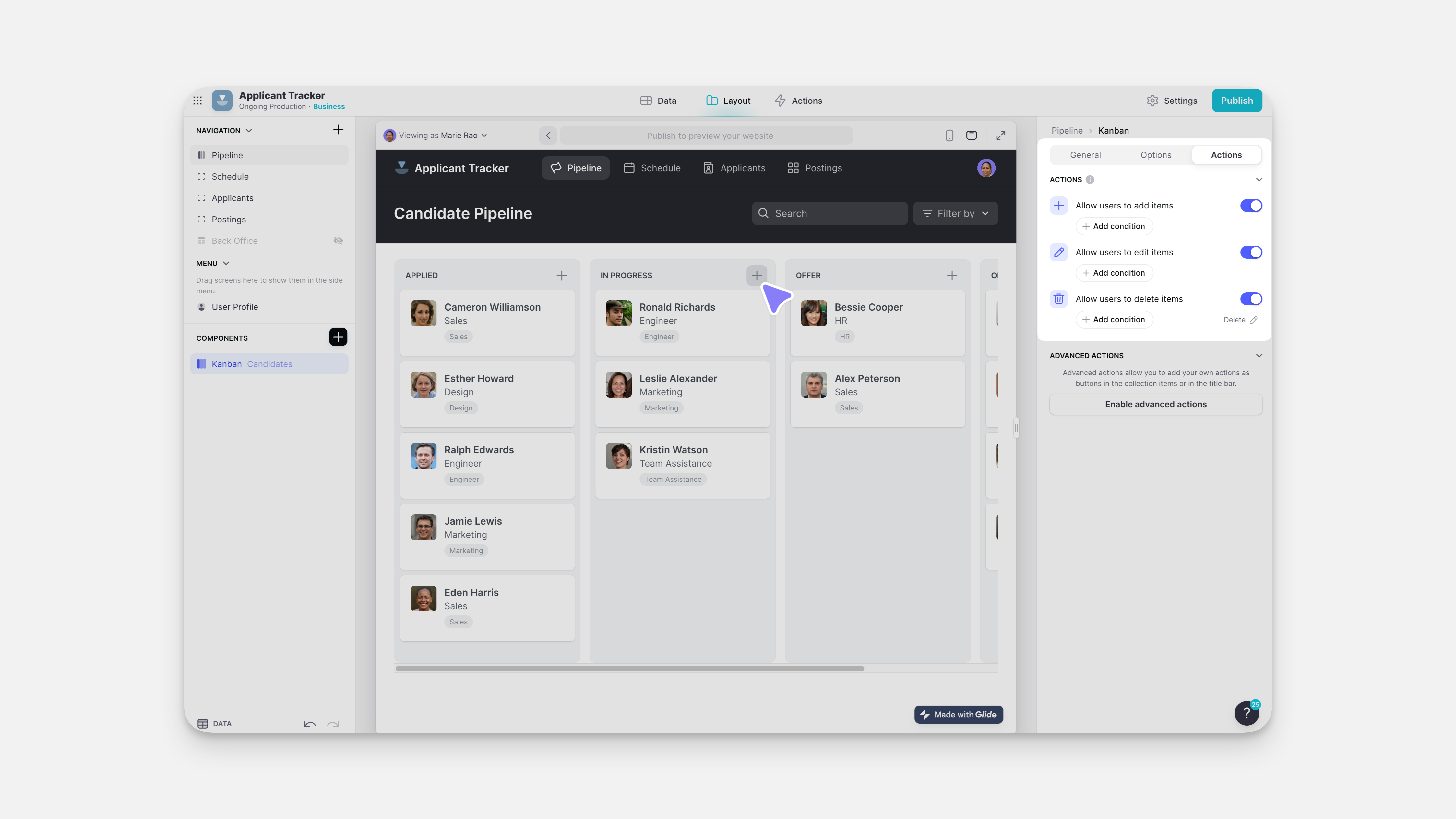 You can configure specific actions for your Kanban board, dictating how users can interact with the data.