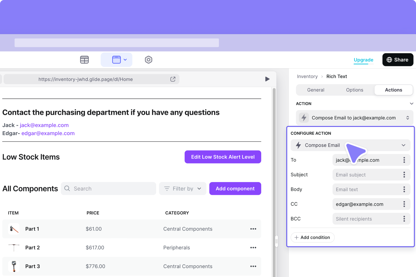 This is the behavior that will be triggered when users tap on the Rich Text component. You can choose from any of the actions available in Glide, or you can create a new action.