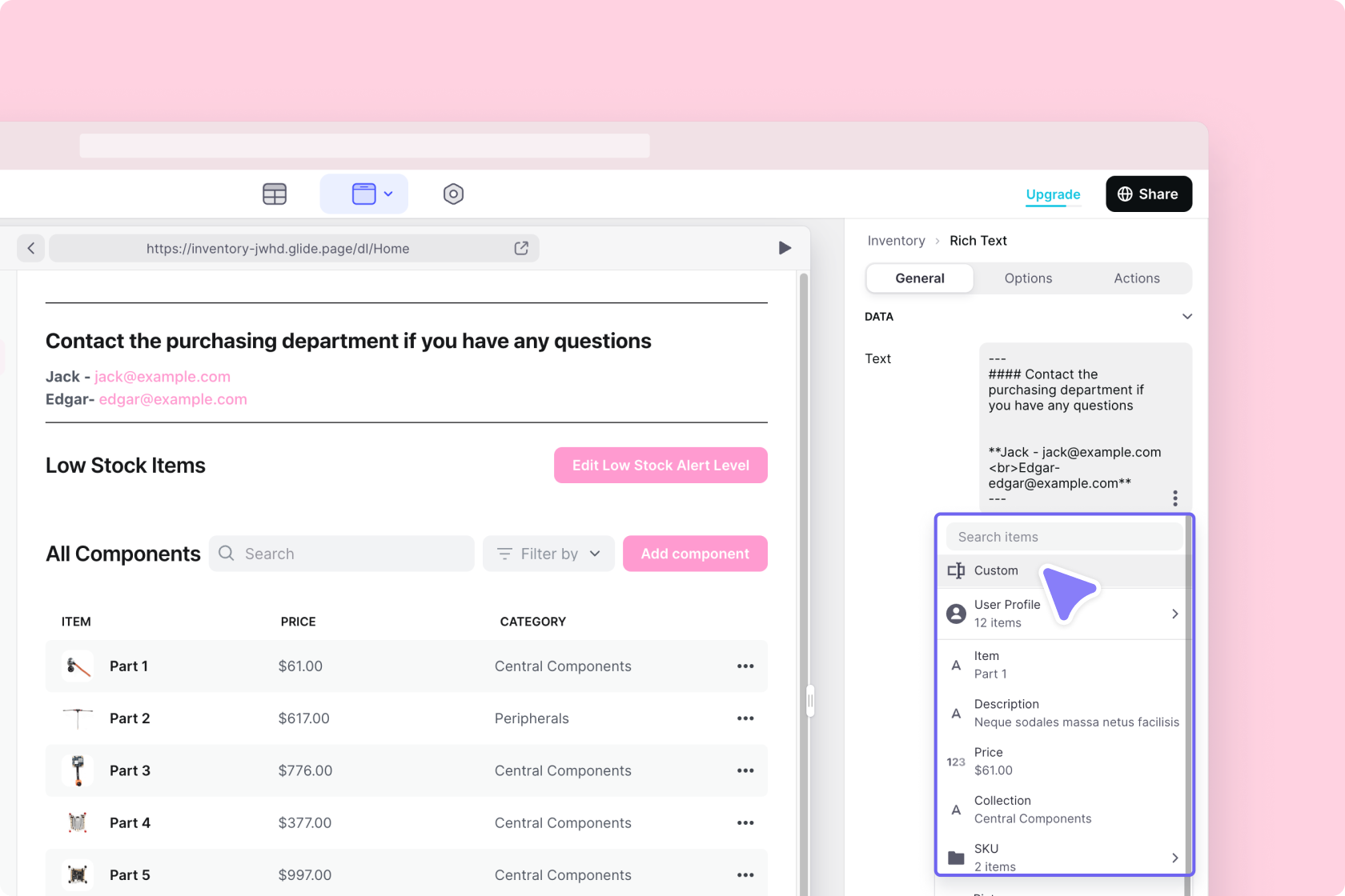 Do not use HTML tags or CSS code in the Rich Text component. Although some CSS code and HTML tags such as <iframe> may function, they are unsupported in Glide and could break at any time. For more information about using CSS in Glide, check out Custom CSS in Glide