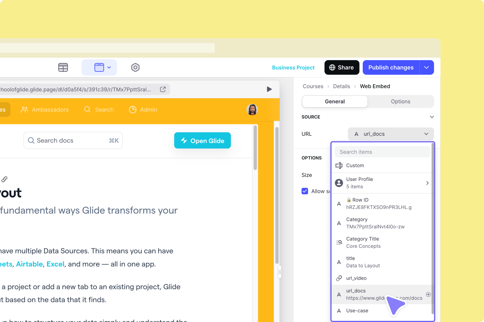 In the General tab on the right side of the Layout Editor, locate the Data or Source section. Use the menu in the URL field to select the value from your data to display, or select Custom to enter a Custom Value for this field.