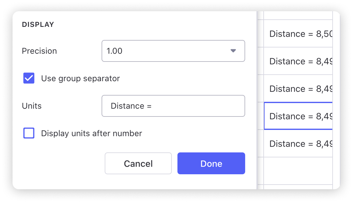 However, you can change the units label and also make it go before the calculation, for example 8,469 Kilometers or Distance to location is 8,469 km