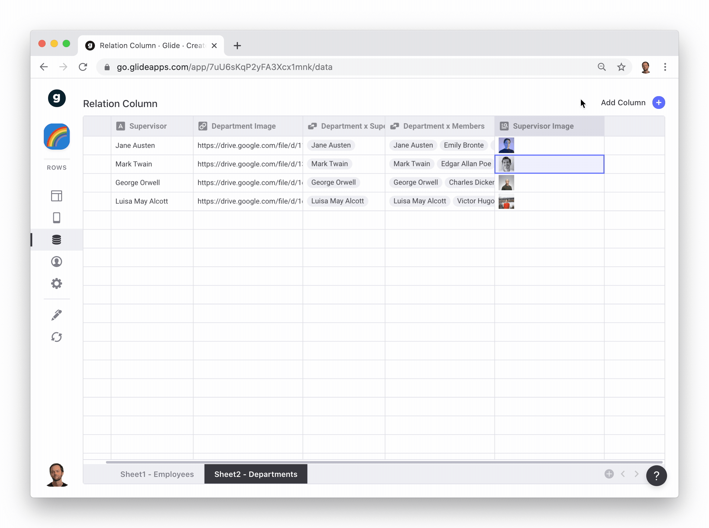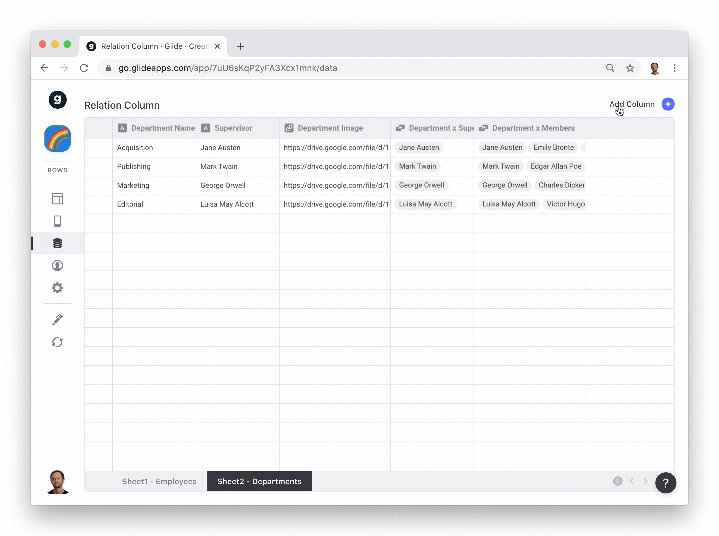 To create a lookup column, head to the Data Editor and add a new column. Choose “Lookup” from the column types and choose the Relation Column that best fits your query. Once you've chosen a Relation Column, choose which column you want to pull data from.