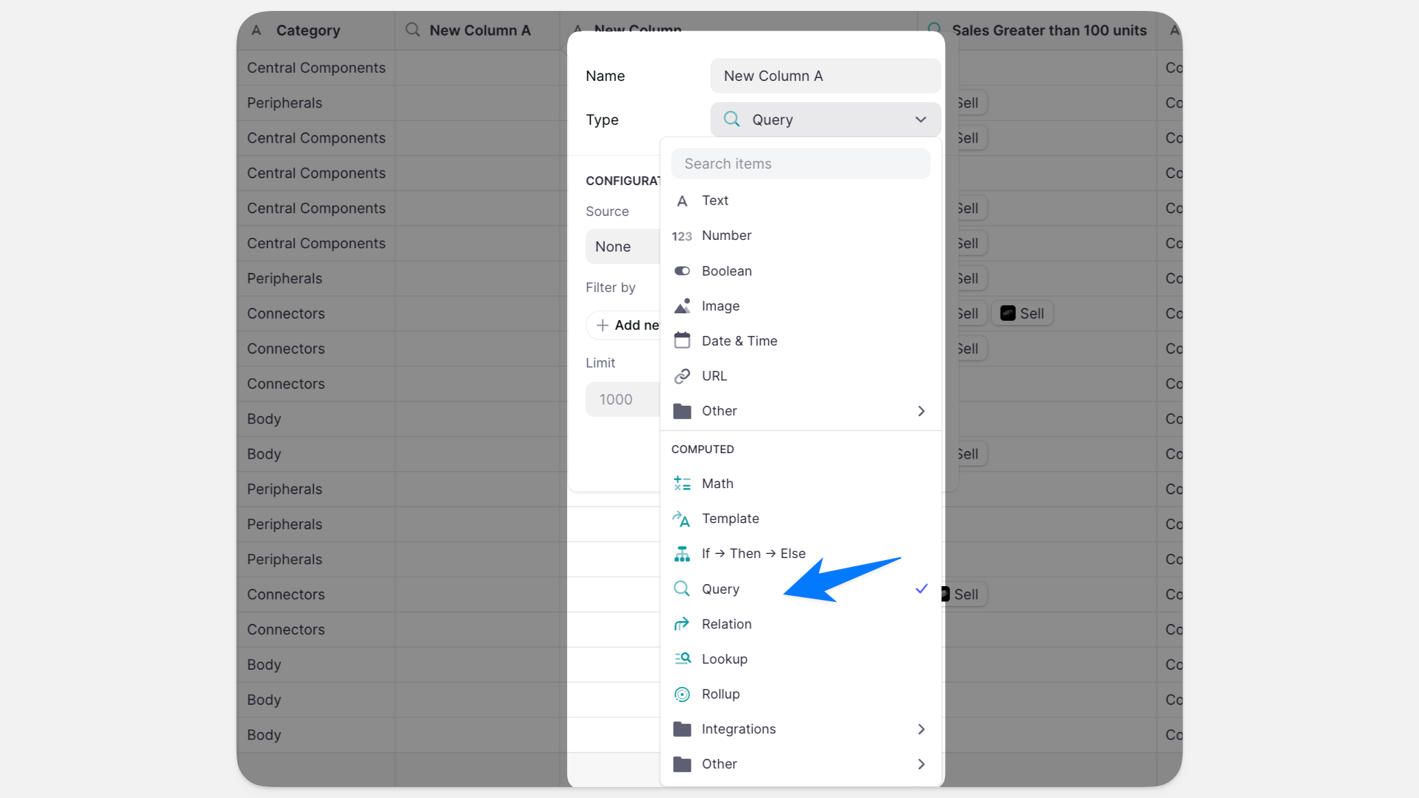 To create a Query column, add a new column in the data editor and select the Query column type.
