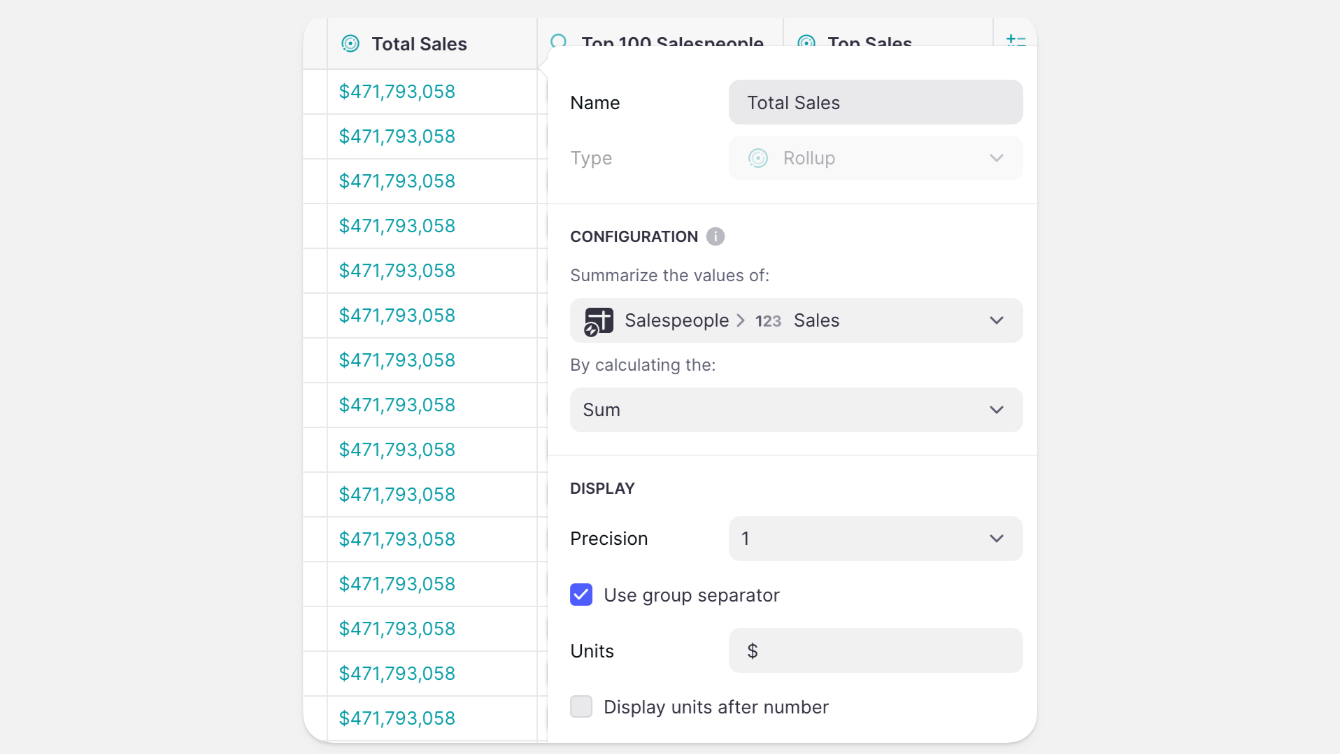 Now, calculate the total sales of the top 100 sales people. Again, a Rollup column is used taking the sum of all sales via the Query column.