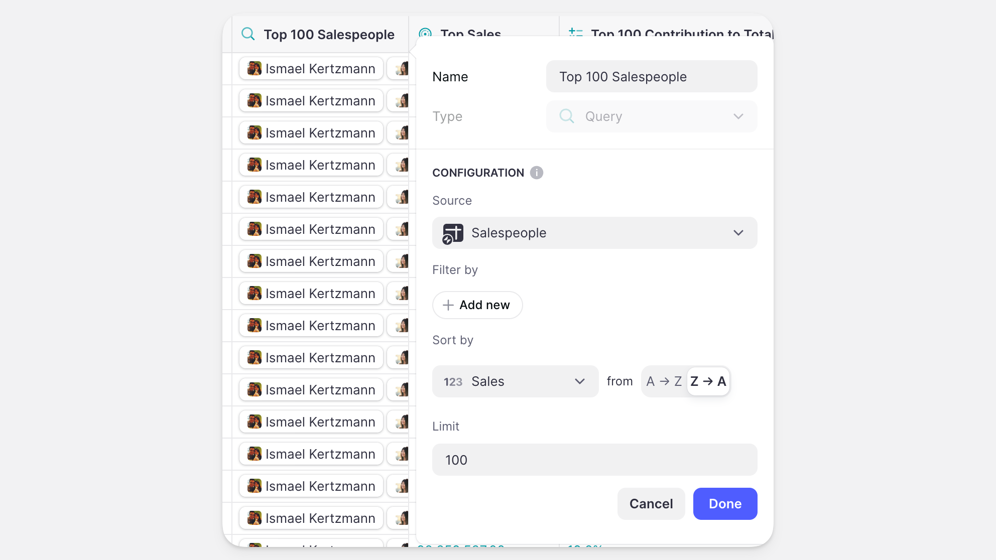 Next, use a Query column to find the top 100 sales people. This column would be configured as follows: