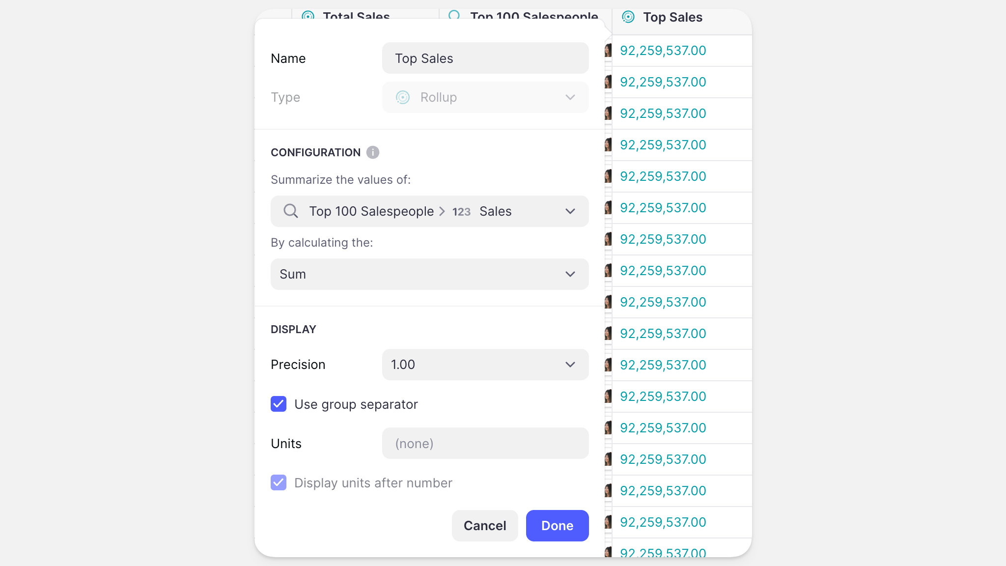 Start by calculating the total sales across all sales people. For this, use a Rollup column to calculate the sum of all Sales: