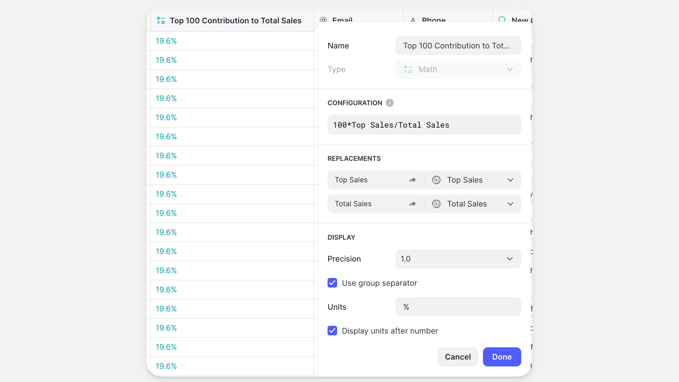 Finally, use a Math column to calculate what percent of sales can be attributed to the Top 100 sales people. The formula for this is 100*Top Sales/Total Sales where Top Sales is the total sales of the top 100 sales people, and Total Sales is the total of all sales.