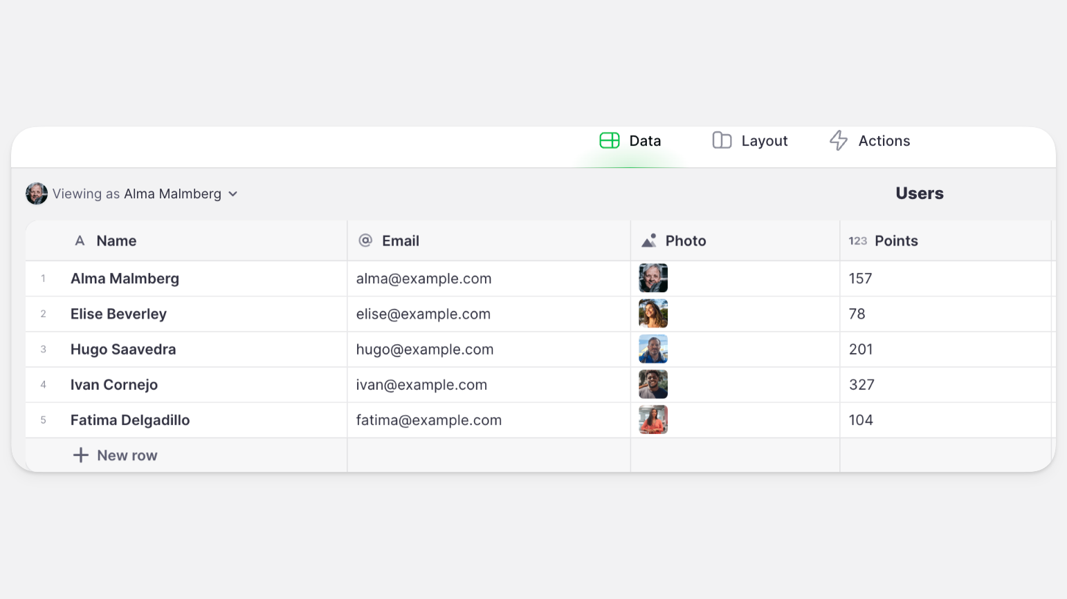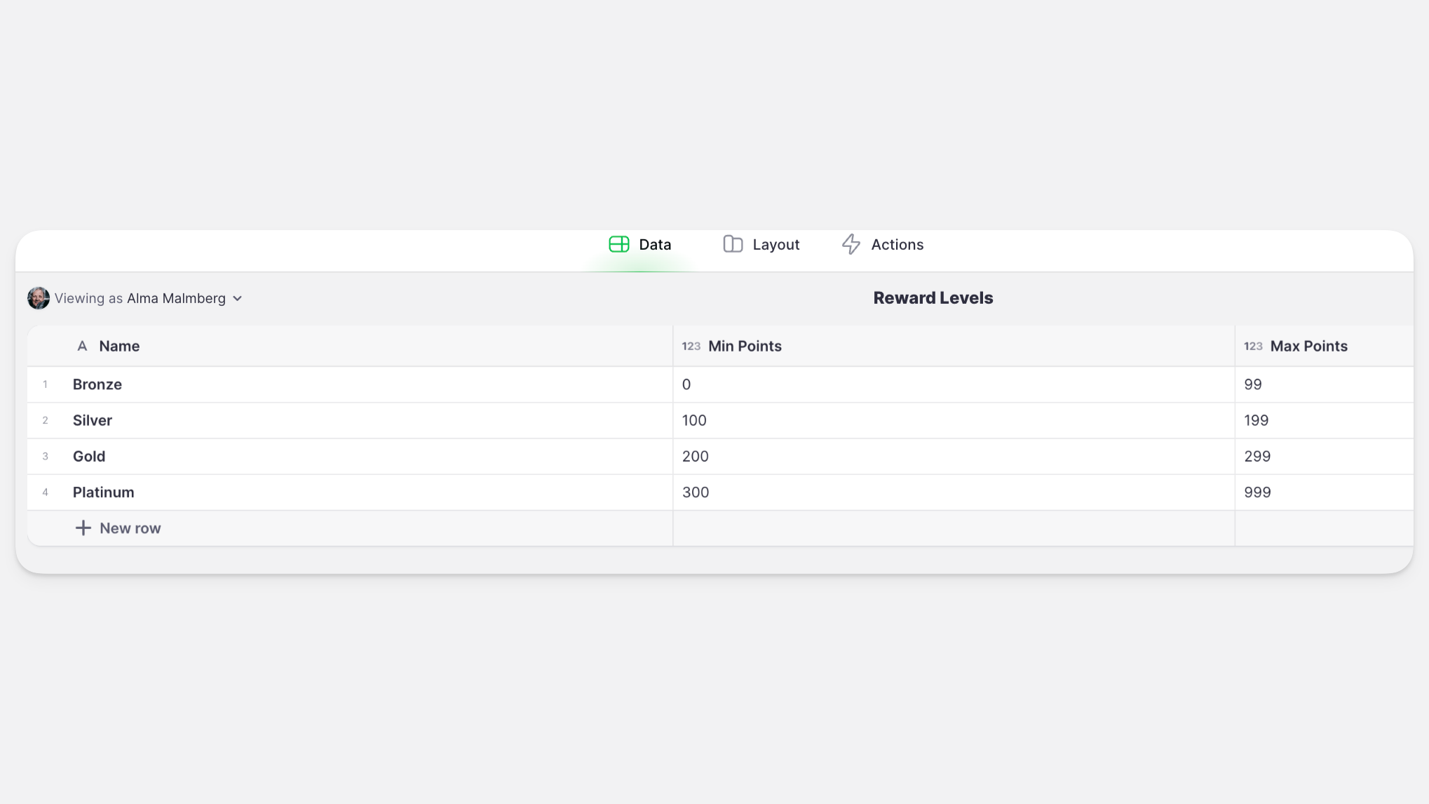 If we look at our first user - Alma - we can see that she has a current points balance of 157, which puts her at the Silver level (100-199). To include each user’s Reward Level on their User Profile page, we need to calculate their level based on points. The Query column automates the whole process.