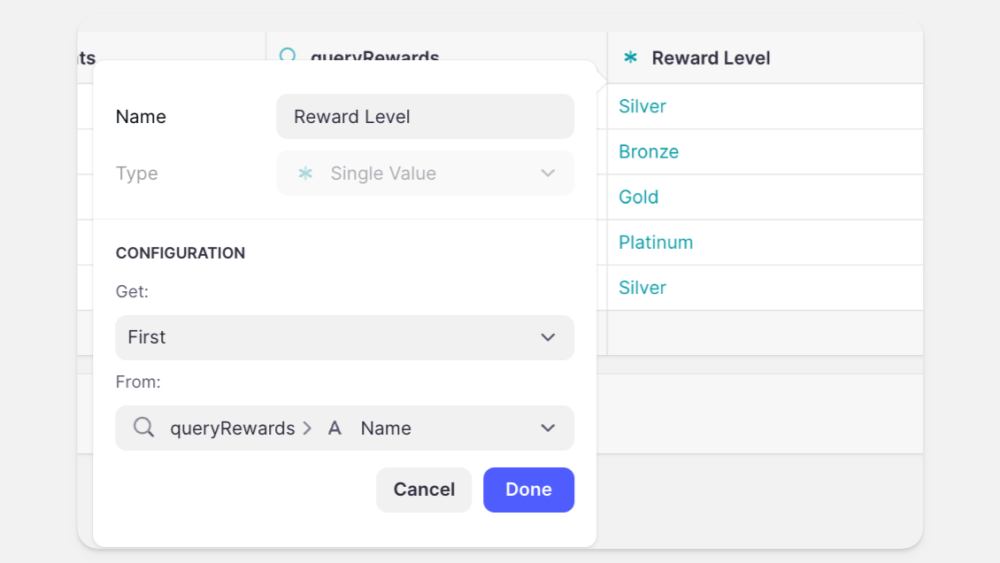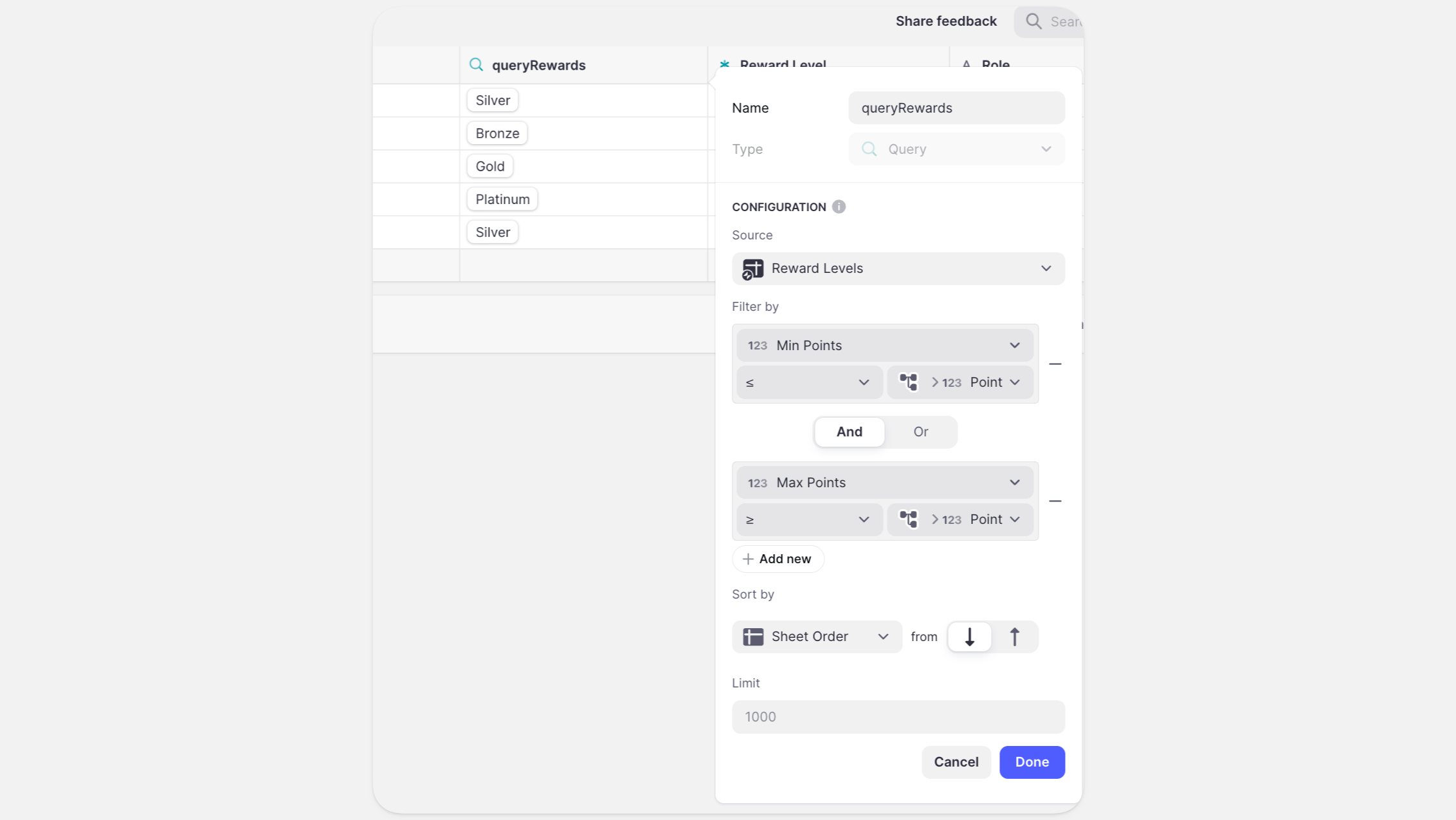 Source- Reward LevelsFilter by- Min Points is less than or equal toThis row→ Points AND Max Points is greater than or equal toThis row→ Points.- The Query in this case will only return a single match, but it will be different for each row in our Users table.