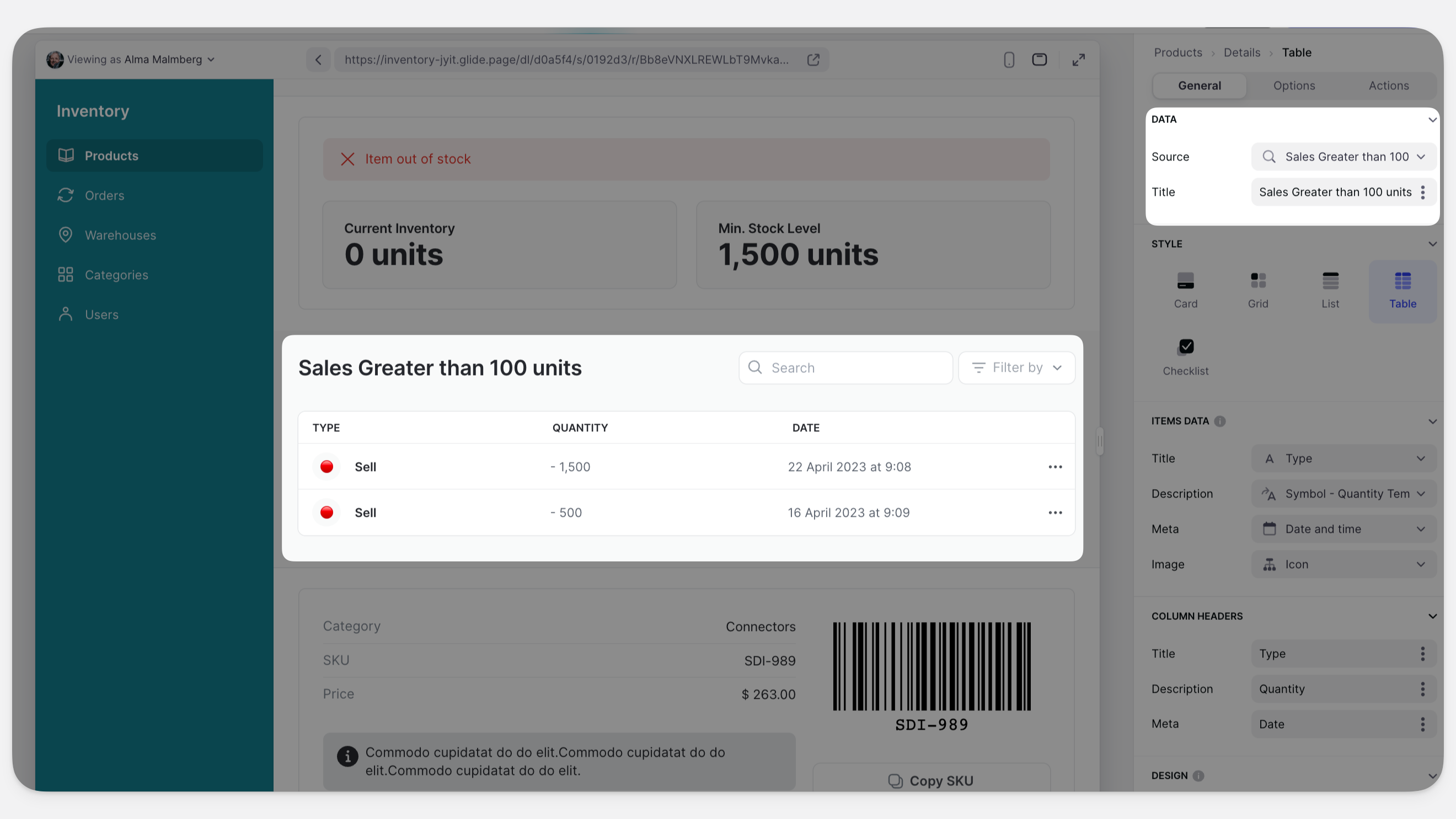 TheThis row filter allows you to match your query results to specific rows in your table. With it, you can relate the rows in a source table with the relevant rows in another table. For example, below we used a Query column to find a list of records for each Product from our Orders table. We filtered for rows where the Quantity was more than 100, and the Type was “Sell”. The This row query automatically matched the results with the relevant rows in our table, organized by SKU.
