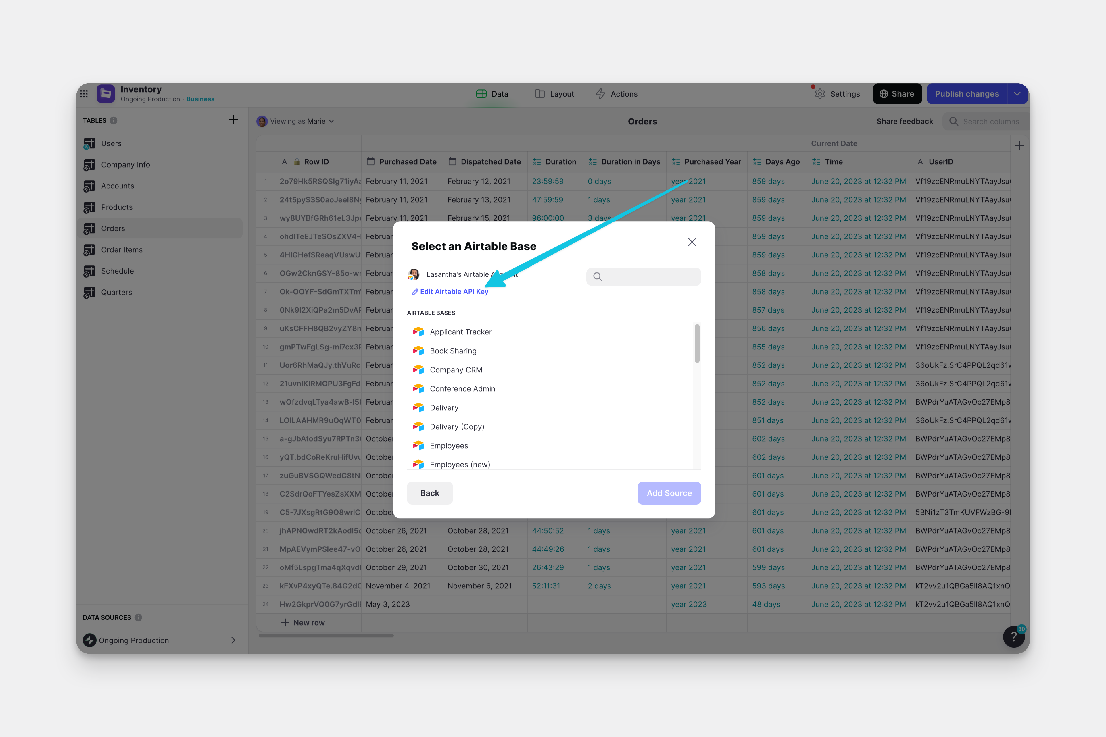 To change the Airtable API key and connect to a different table, first make sure the new table is owned by the same email address you use with your Glide account. Then: