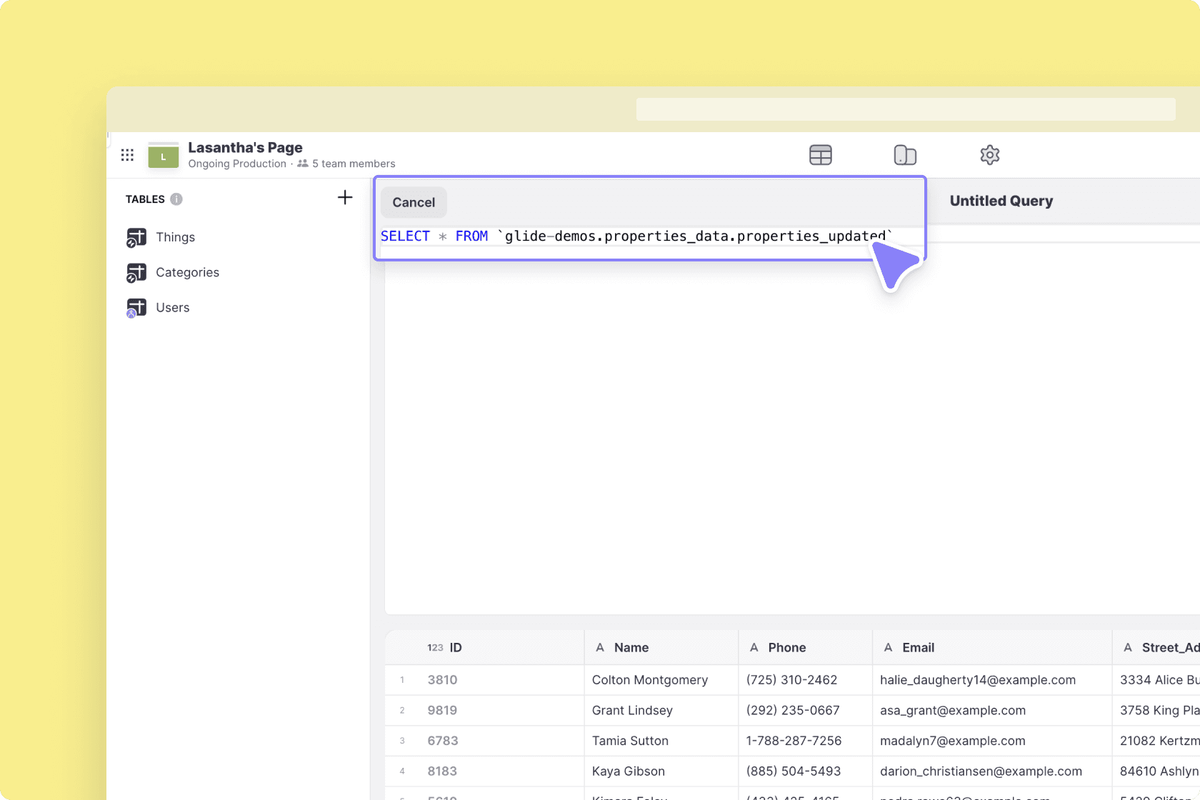 Unlike our other data integrations, changes you make to BigQuery data in Glide do not write back to your BigQuery data warehouse. Glide uses BigQuery as a read-only data source.