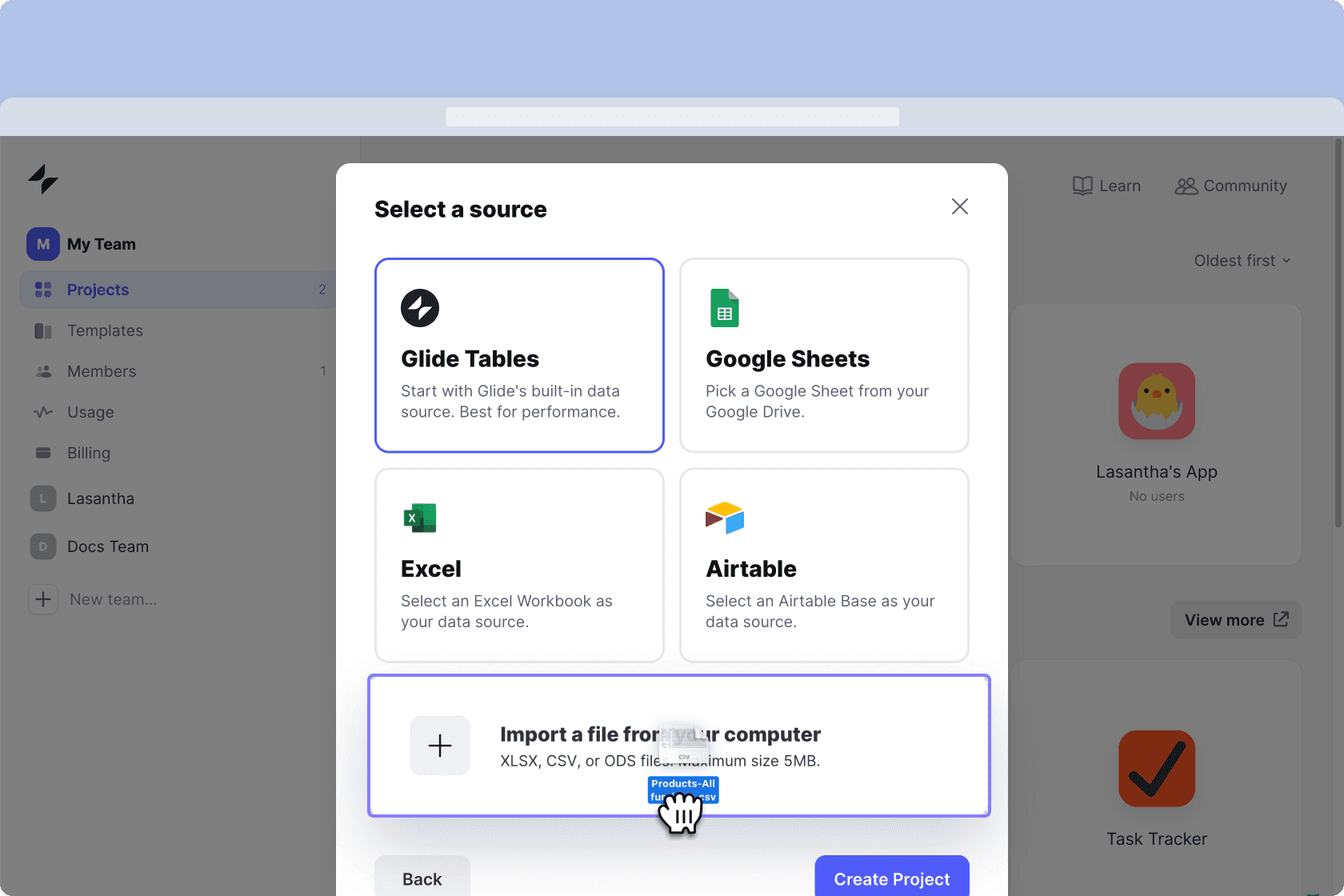 .xlsx,.csv, or.ods) and click Upload or simply drag and drop to create your new project!