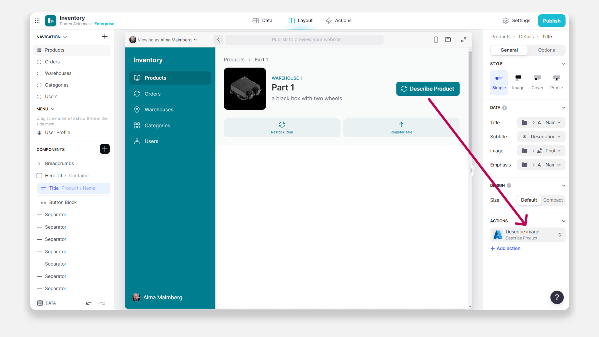 Azure, a tool from Microsoft, provides out-of-the-box features to simplify app creation. One of these features is called Computer Vision, a powerful AI tool that explains what’s in an image. With the Describe image feature in Glide, you can have an image analyzed by Azure, and it will tell you what’s in the image.