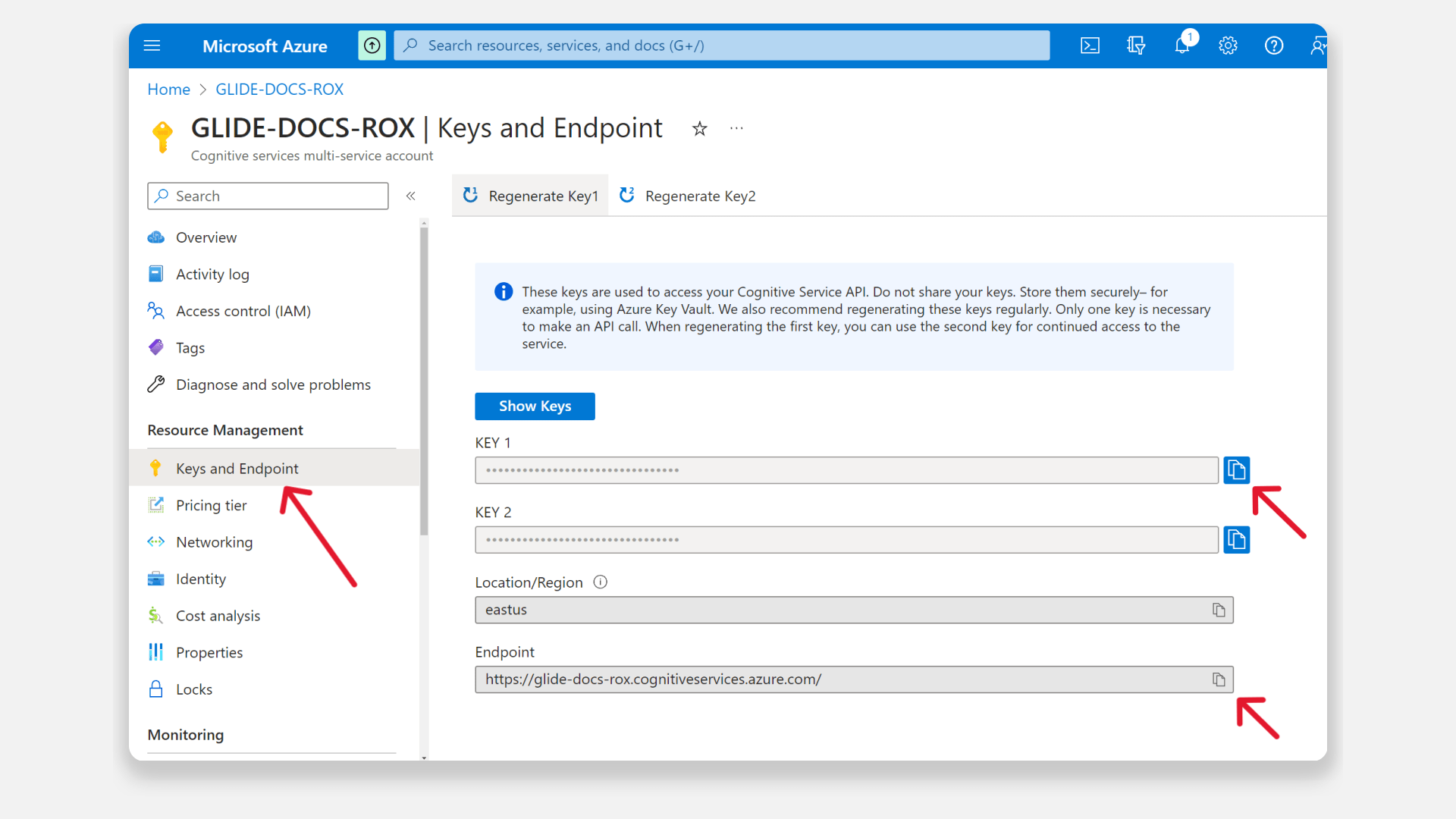 - Navigate to the Keys and Endpoint page on your Azure resource.