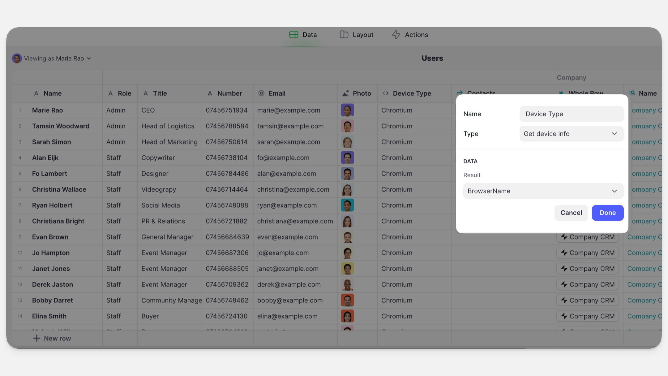 It’s important to note that when used as a Computed Column, the value returned will only be available to the current user. If you want to gather information about all of your users' devices, then you should use it as an Action, so that the results are stored in Basic Columns.