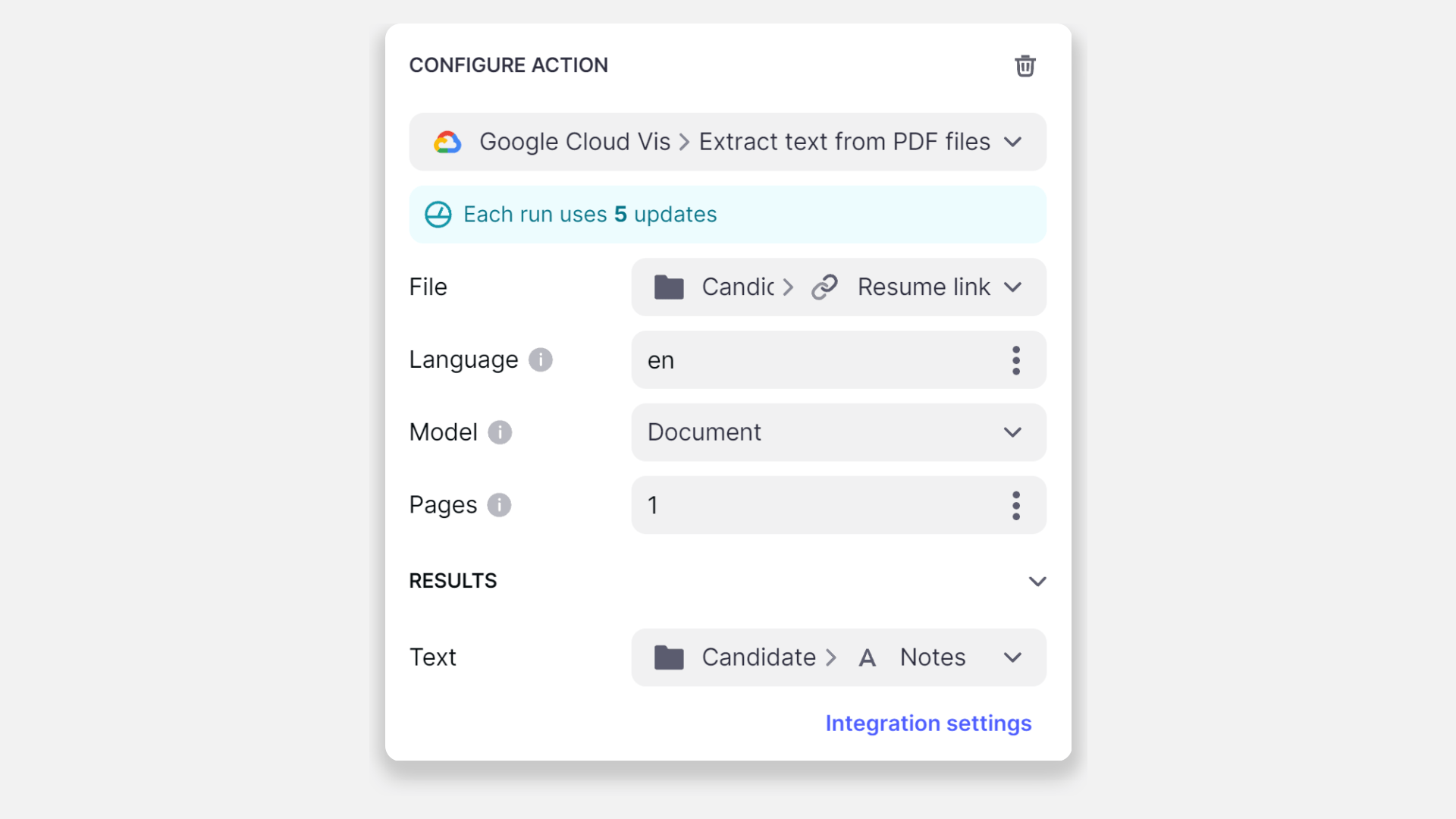 Google Cloud’s Vision API allows you to use the Vertex AI Vision environment to build and manage applications. Vision also uses machine learning models to process and interpret images. In Glide, you can use the Google Cloud Vision integration to extract text from PDFs and image files.
