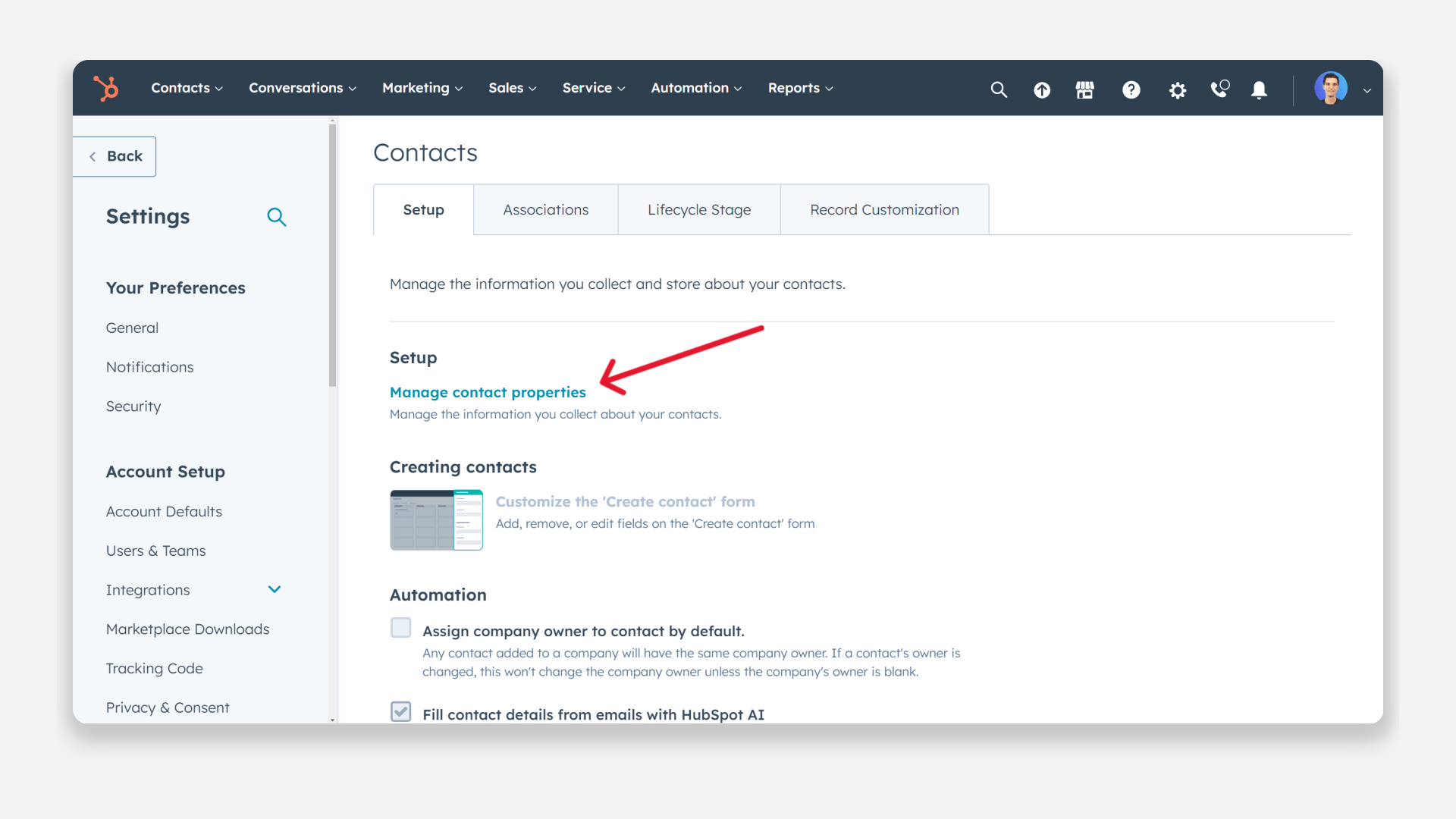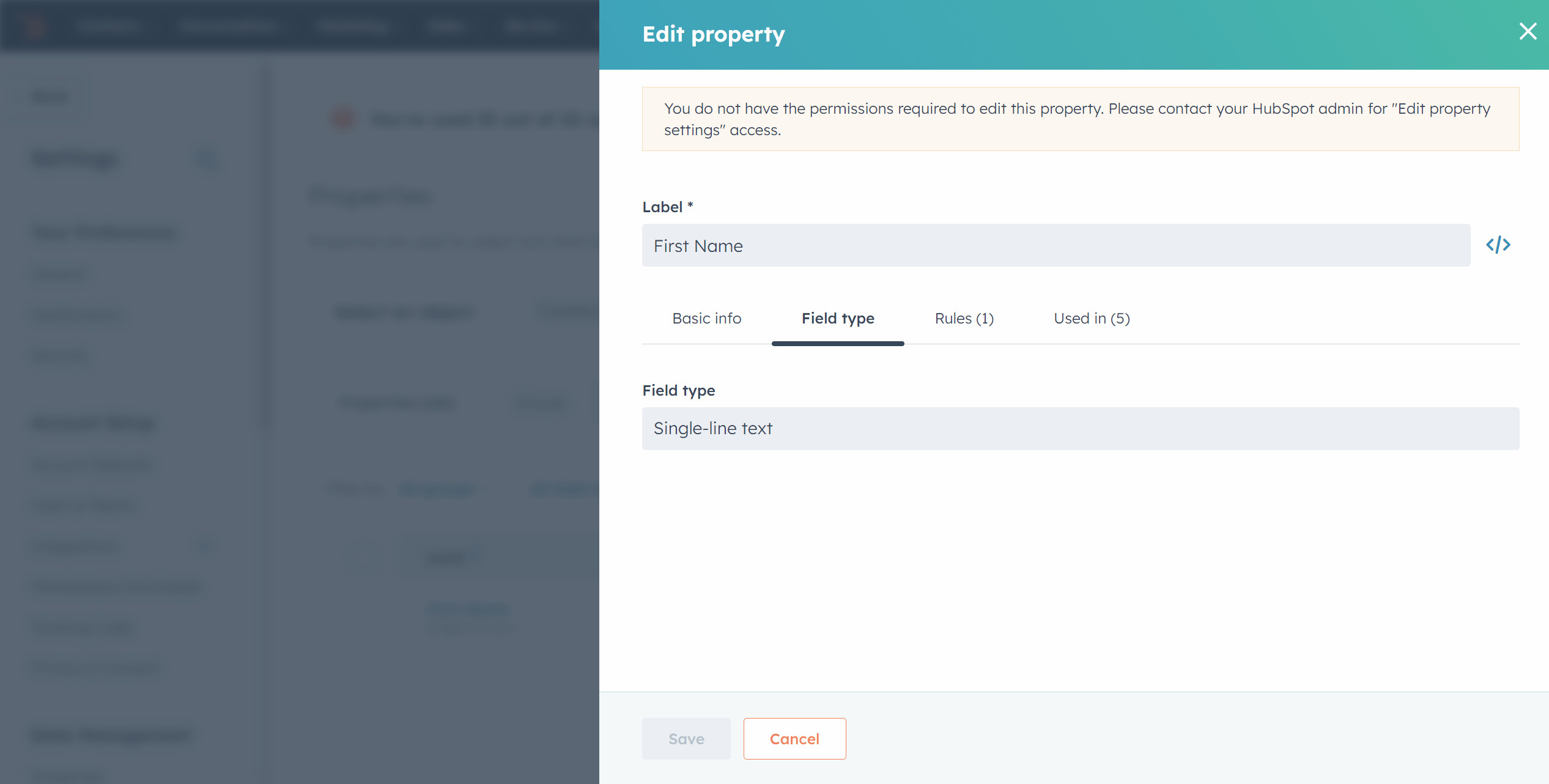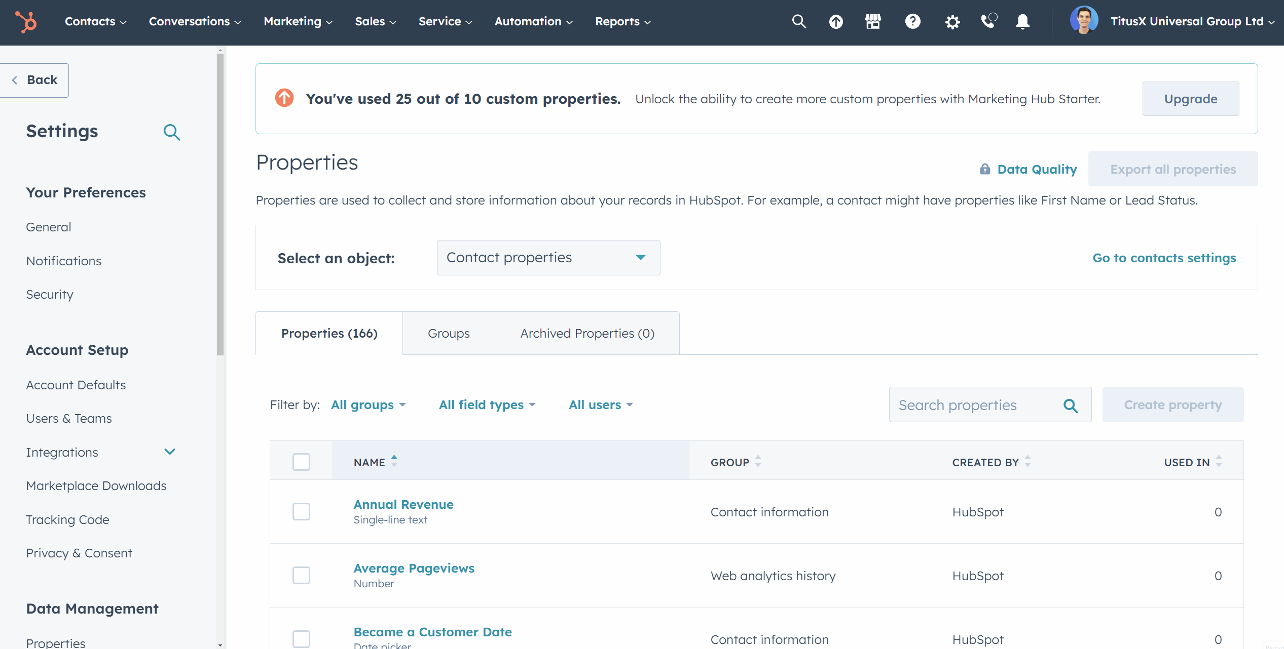 - Properties are the different fields where you can store information. For example a Contact has properties like First Name, Last Name, Location, etc.