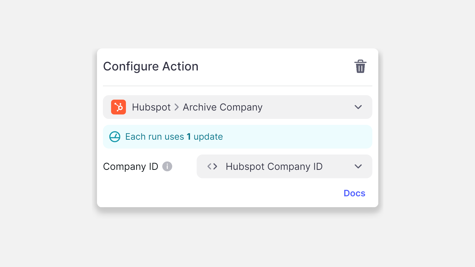 The Archive Company action hides a company in Hubspot. You can specify a column that houses Hubspot Company IDs to automate this process.