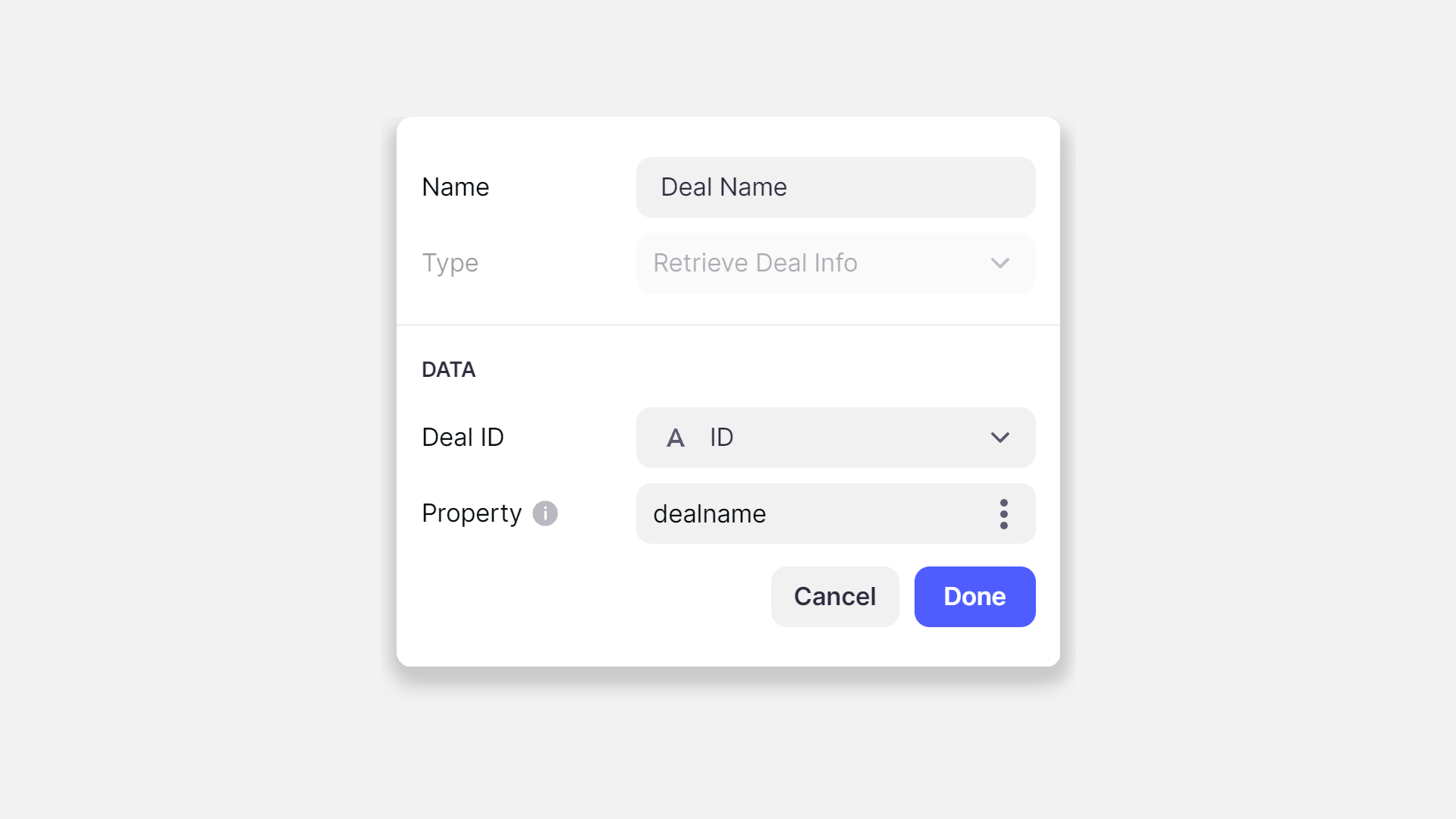 The Retrieve Deal Info action looks up a deal in Hubspot with the ID you provide and returns the property you request. You'll need a column with Deal IDs that match Hubspot, as well as the Property name from Hubspot.