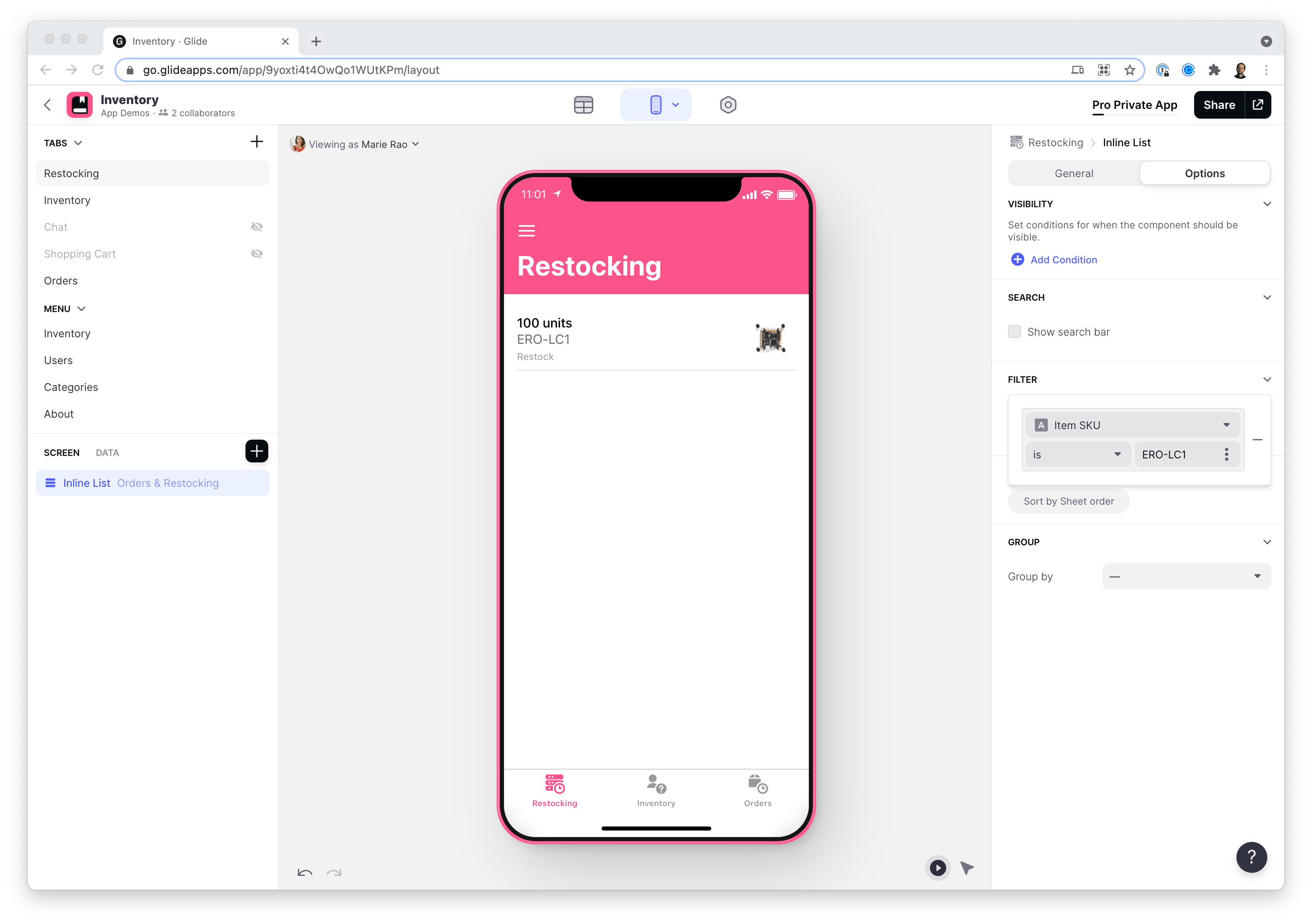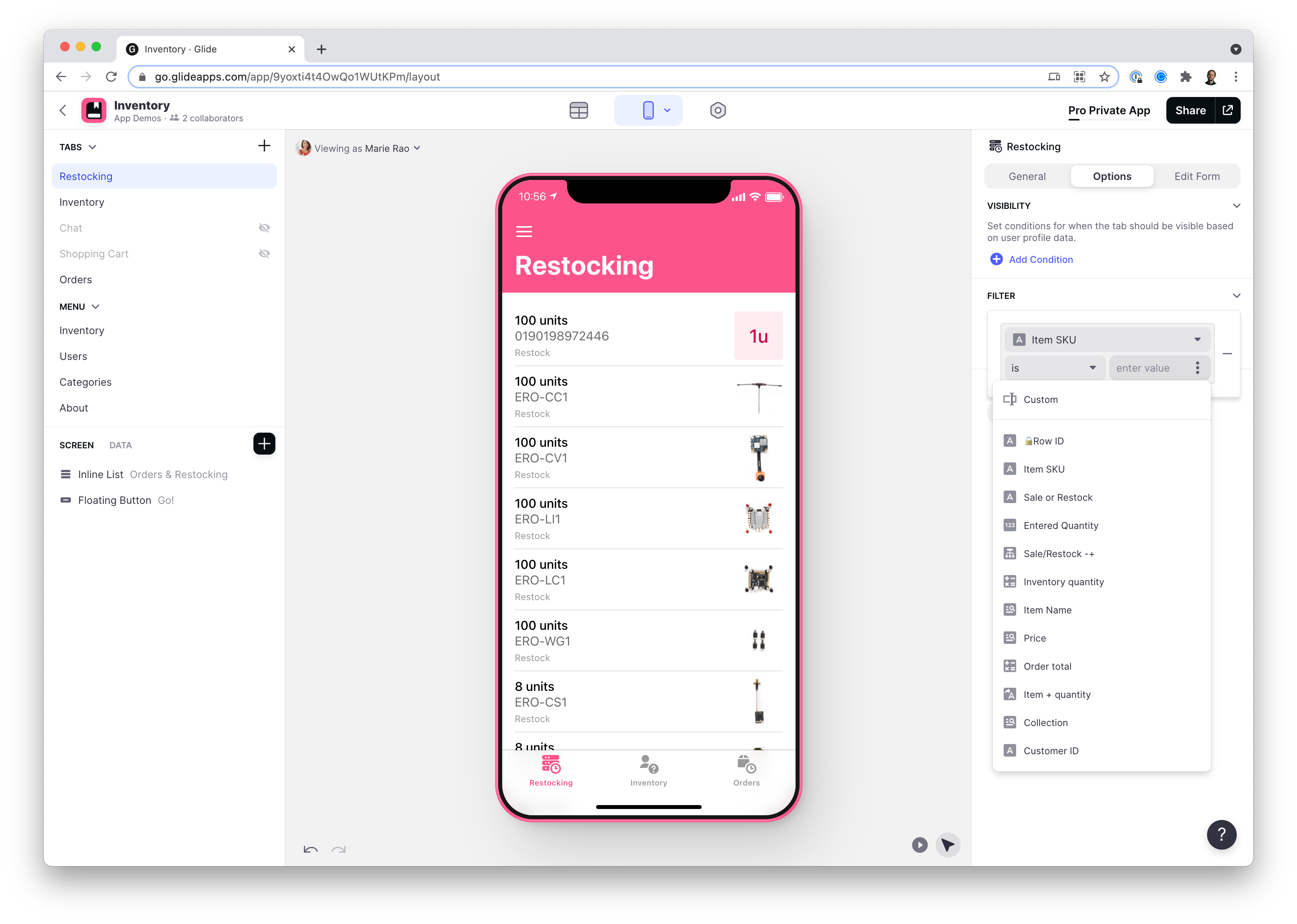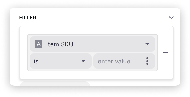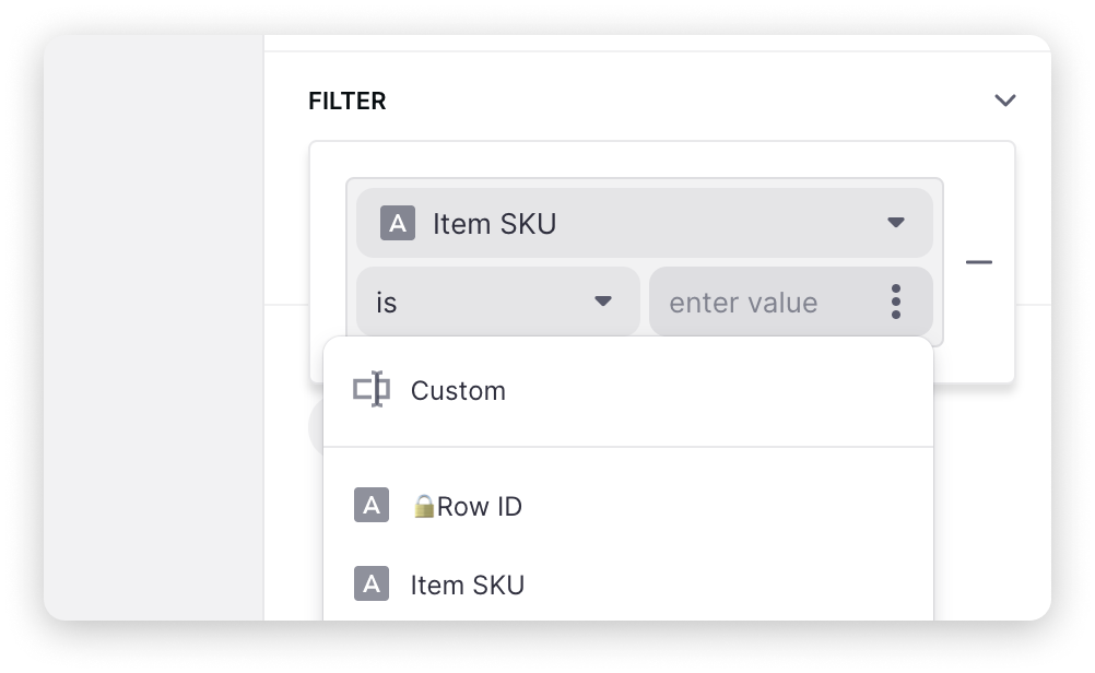 If we use a custom value in our filter condition then that condition will evaluate that custom value on every one of our list items. In other words, if we filter our list to show items where Item SKU is 'ERO-LC1' (a custom value we enter in the condition itself) then every one of our list items will have that same condition.