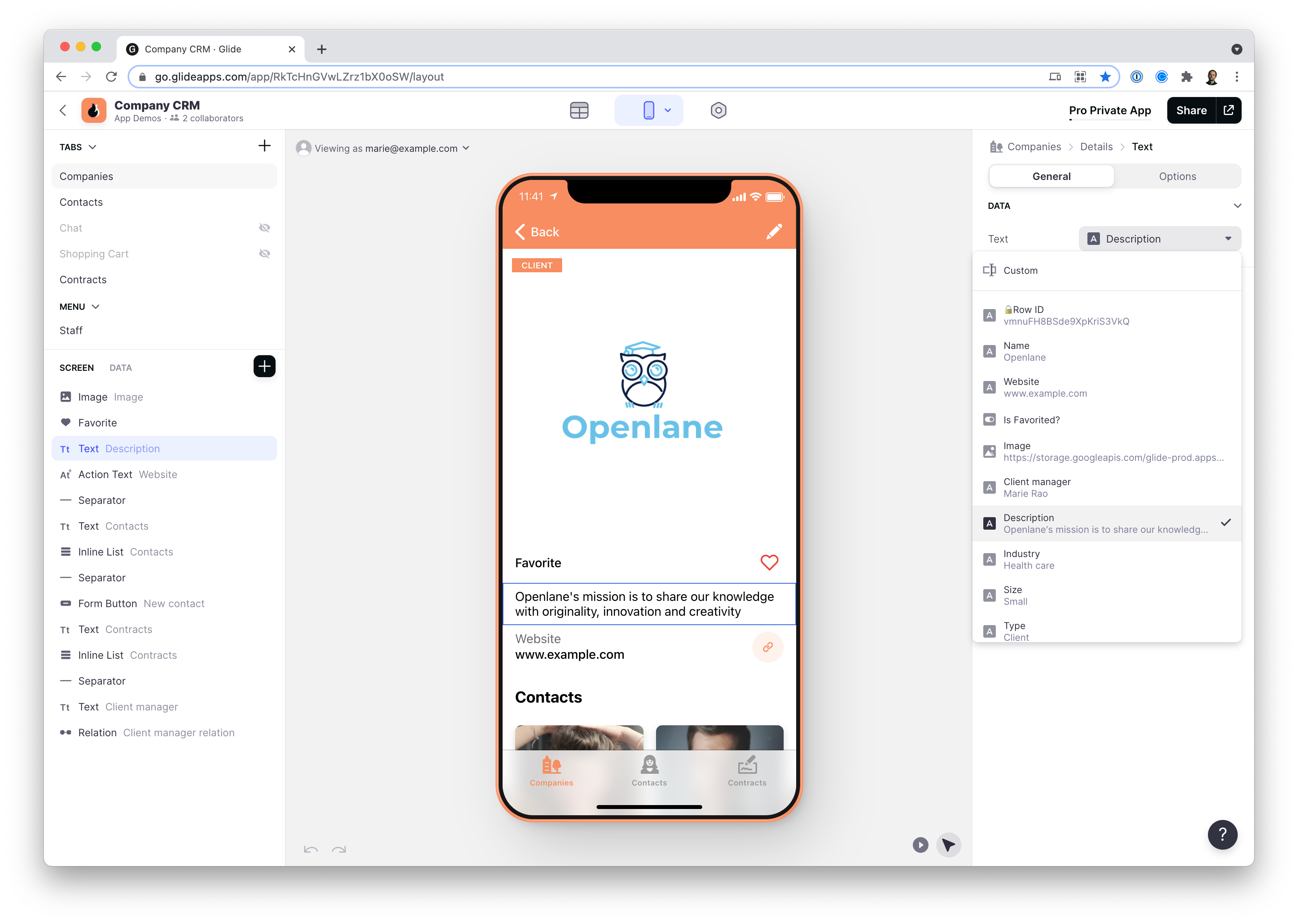 Above you can see the settings for a text component. Currently, it's bound to the Description column. This means that for every item in that list, the description will be different – because it is coming from the data in that list's table.
