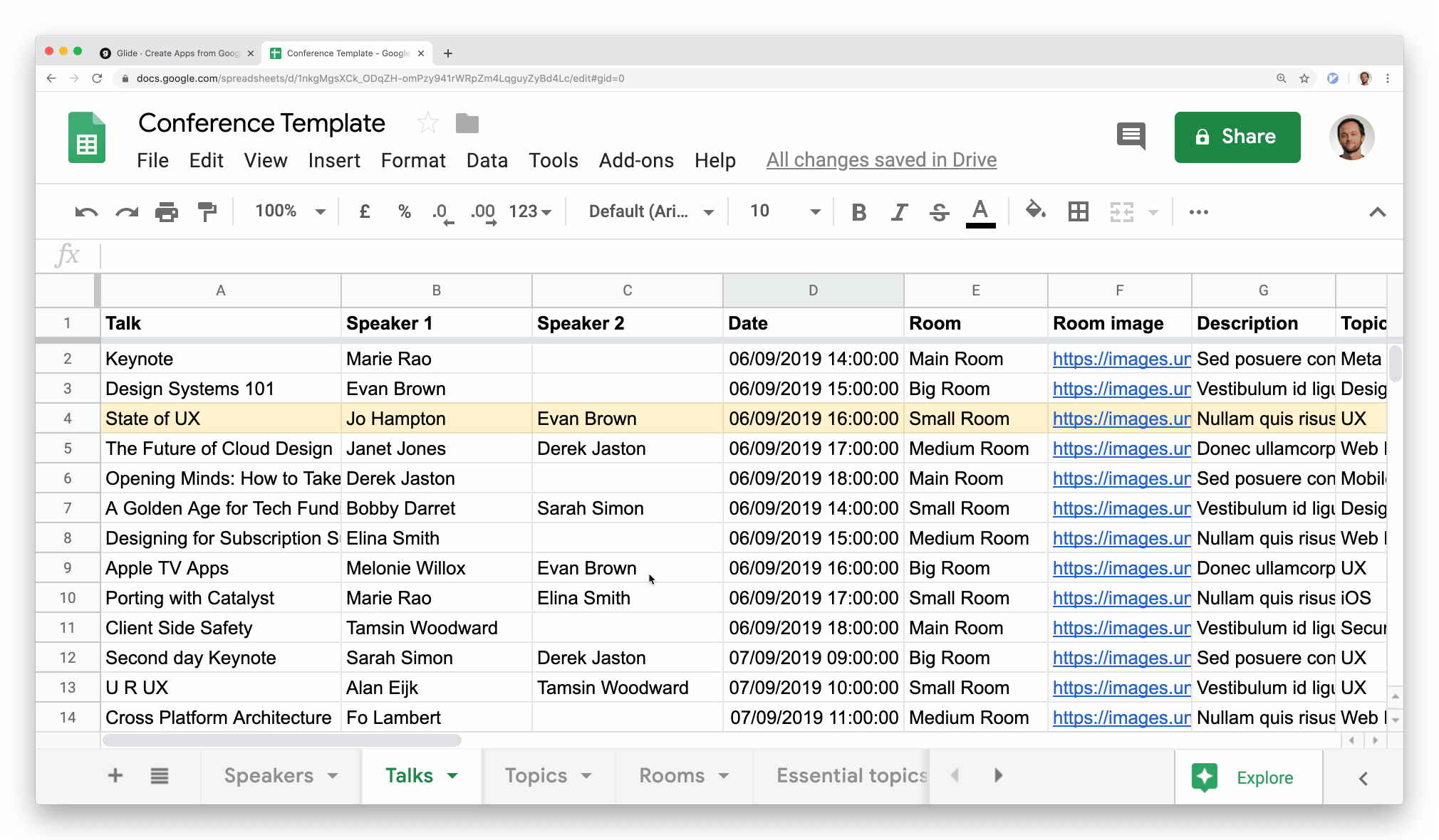 In Google Sheets, rows don't really have an identity apart from their row number. In the image below we can see that the talk State of UX is located in row 4.