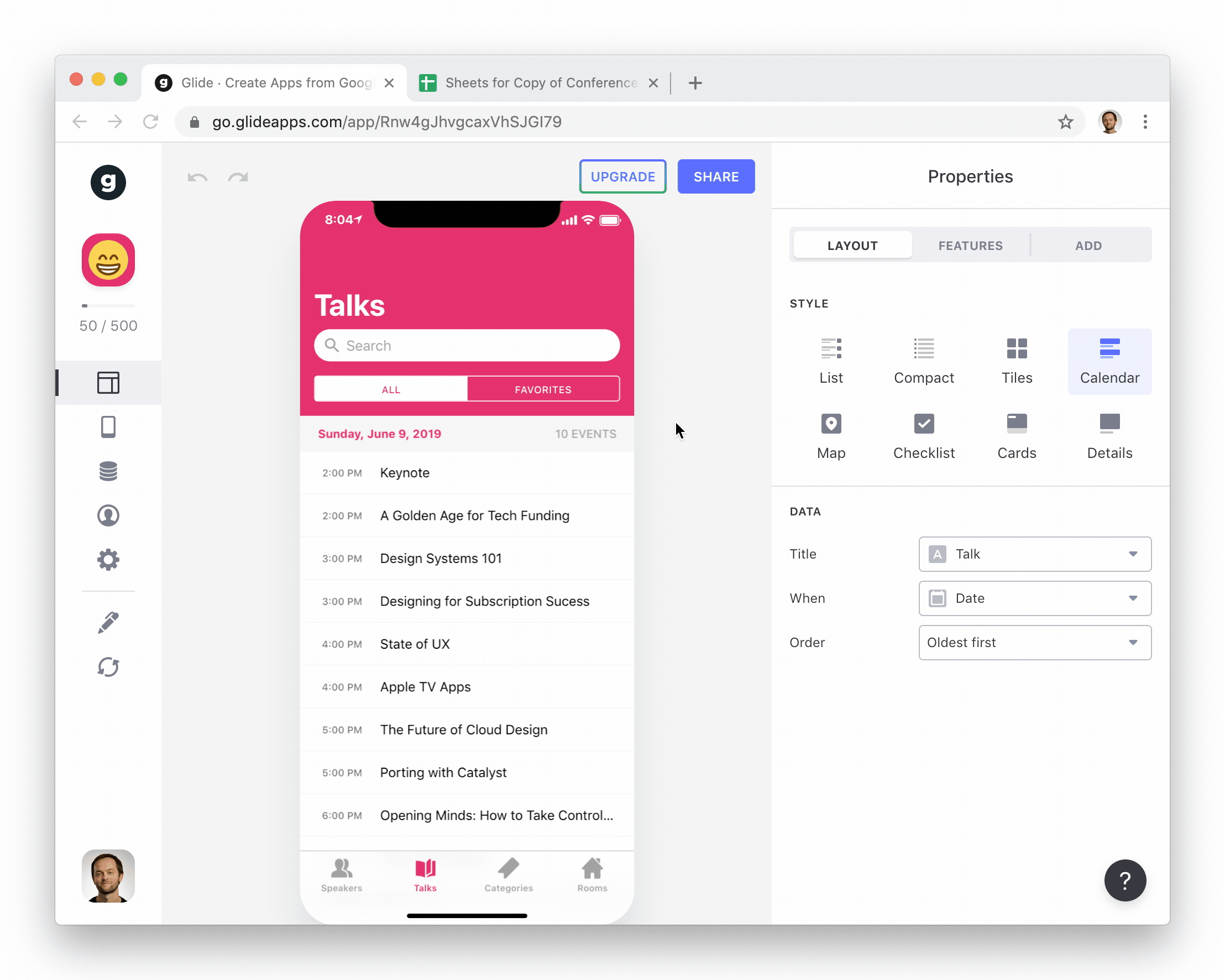 In the image below, you can see this happen with the Favorite component after we delete some rows from our sheet. After we delete them, the item we favorited changes to a totally different talk.