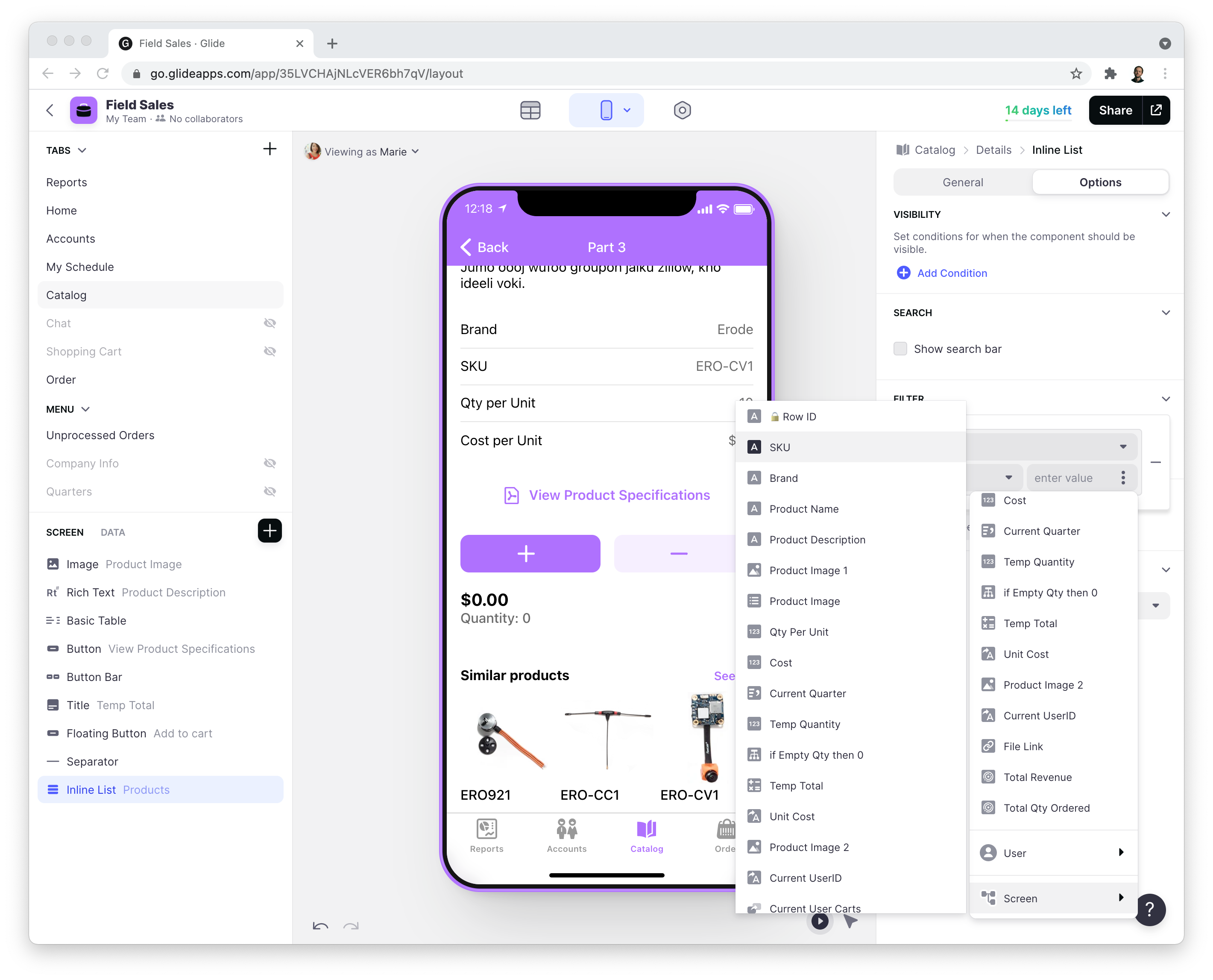 However, to exclude the current item we create a filter condition that says: Show items where the SKU is not the SKU in the current screen.