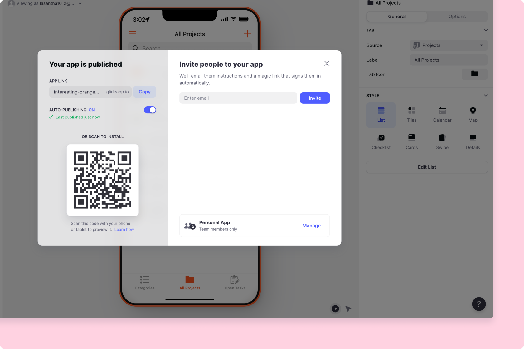 In the top right of Glide, you'll see a button where you can publish your project. After you've published it, you'll see this screen.