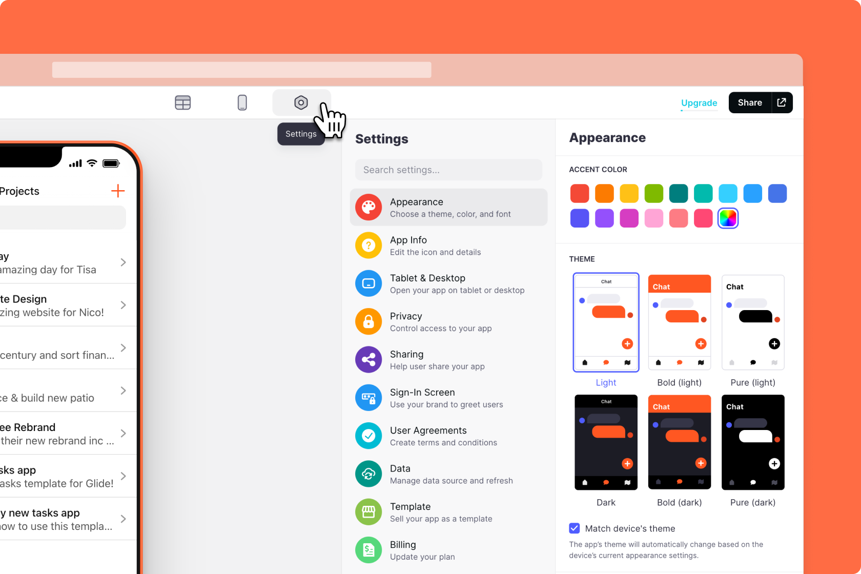There's so much you can do to customize your projects. The best place to start is the Settings area. Here you can change many things about your app with a single click. Here are some suggestions for your first change.